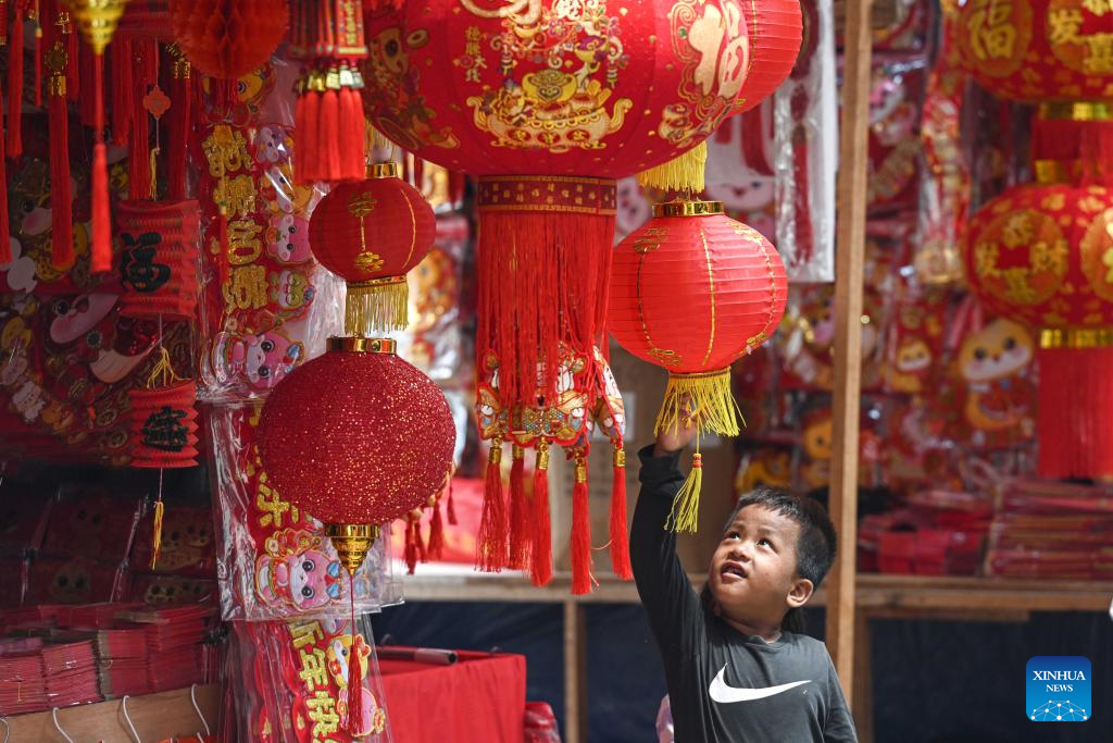 A boy touches a red lantern at a street stall selling Chinese New Year decorations in Glodok Chinatown of Jakarta, Indonesia, on Jan. 3, 2025. The upcoming Chinese New Year, or Spring Festival, falls on Jan. 29, 2025. (Xinhua/Agung Kuncahya B.)