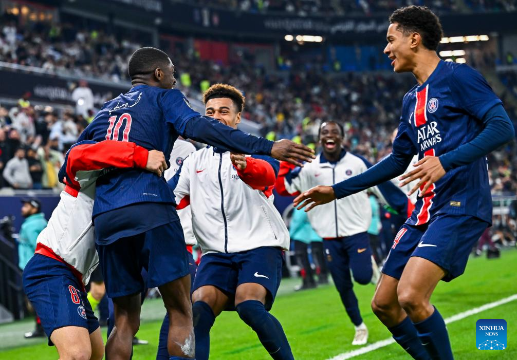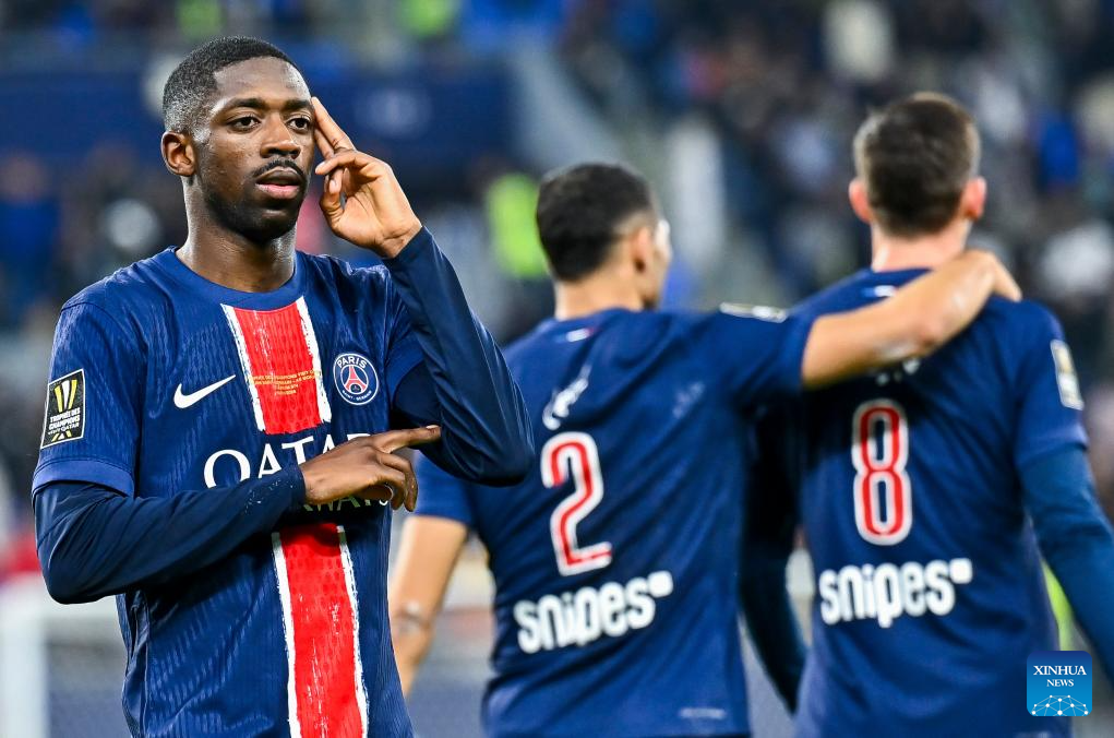 Ousmane Dembele (L) of Paris Saint-Germain celebrates with teammates after scoring during the French Super Cup football final match between Paris Saint-Germain (PSG) and AS Monaco at the 974 stadium in Doha, Qatar on Jan. 5, 2025. (Photo by Nikku/Xinhua)