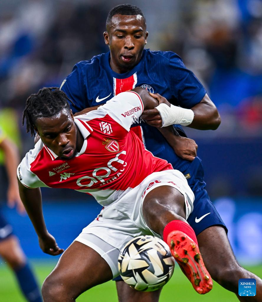 Willian Pacho (R) of Paris Saint-Germain vies with George Ilenikhena of AS Monaco during the French Super Cup football final match between Paris Saint-Germain (PSG) and AS Monaco at the 974 stadium in Doha, Qatar on Jan. 5, 2025. (Photo by Nikku/Xinhua)