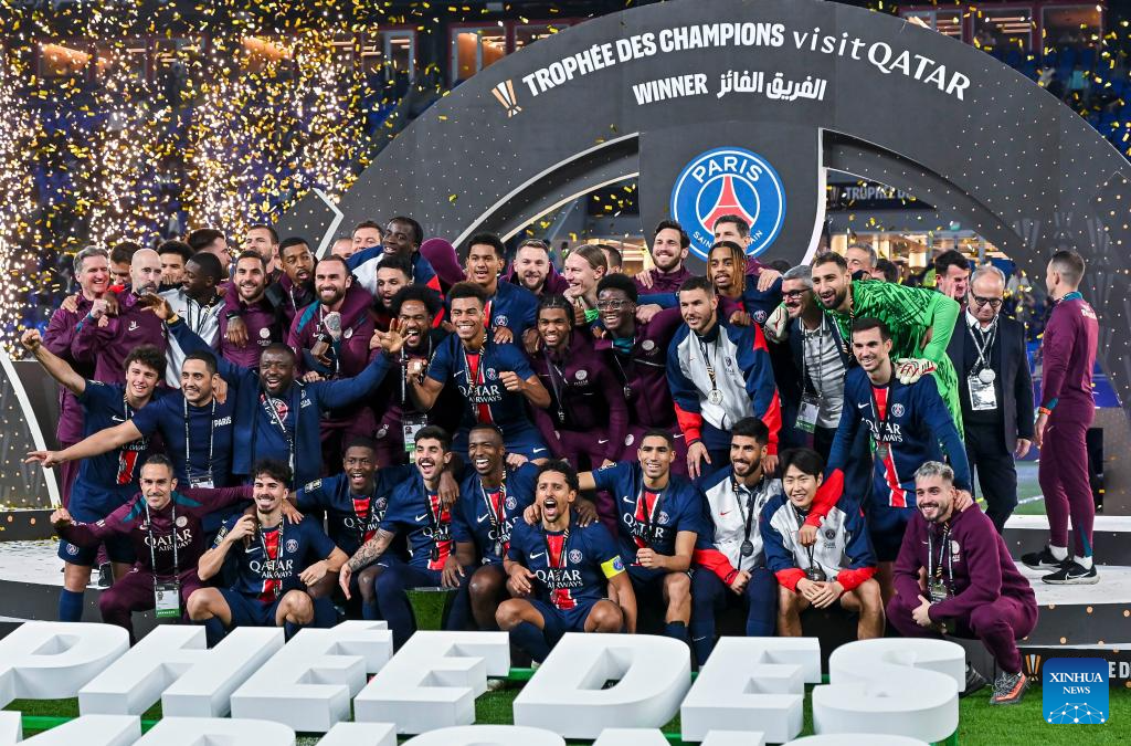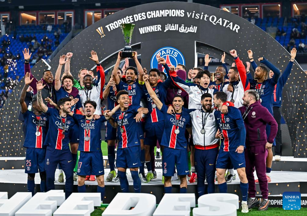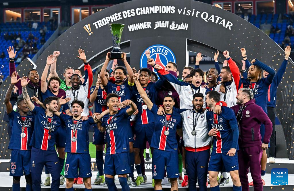 Players of Paris Saint-Germain celebrate with the trophy during the awarding ceremony after the French Super Cup football final match between Paris Saint-Germain (PSG) and AS Monaco at the 974 stadium in Doha, Qatar on Jan. 5, 2025. (Photo by Nikku/Xinhua)