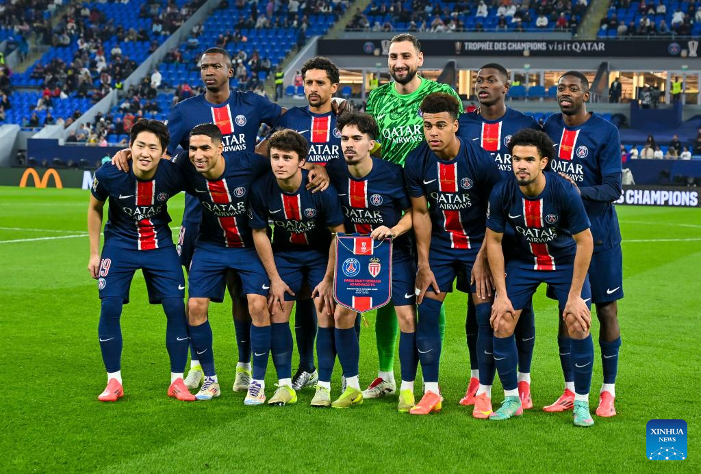 Players of Paris Saint-Germain pose for photos before the French Super Cup football final match between Paris Saint-Germain (PSG) and AS Monaco at the 974 stadium in Doha, Qatar on Jan. 5, 2025. (Photo by Nikku/Xinhua)