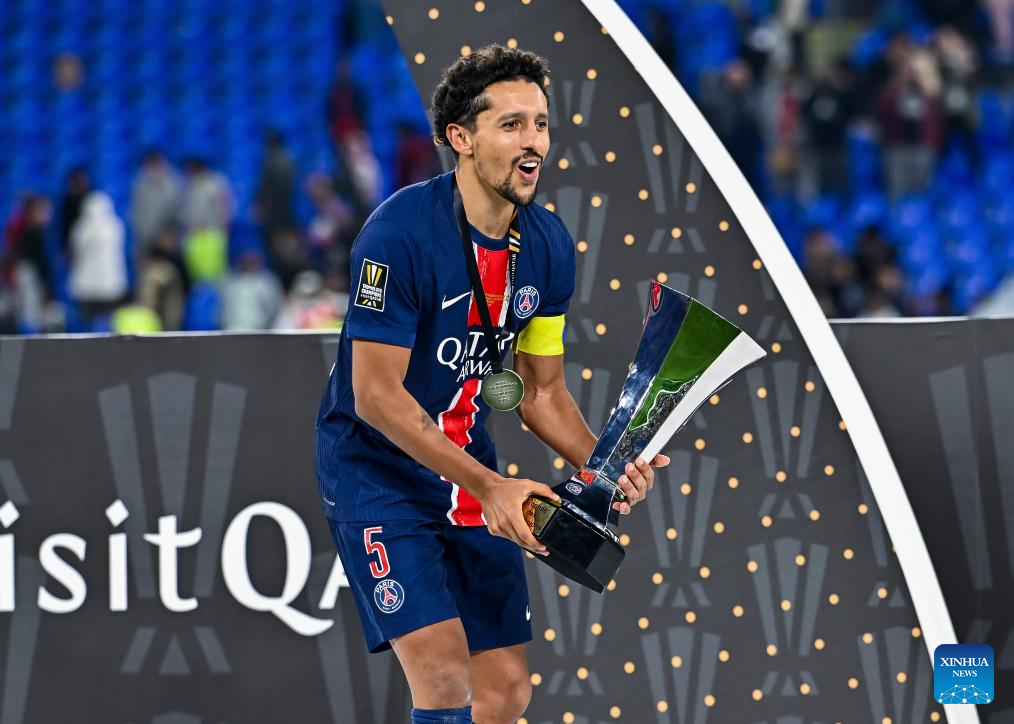 Paris Saint-Germain's captain Marquinhos celebrates with the trophy after the French Super Cup football final match between Paris Saint-Germain (PSG) and AS Monaco at the 974 stadium in Doha, Qatar on Jan. 5, 2025. (Photo by Nikku/Xinhua)