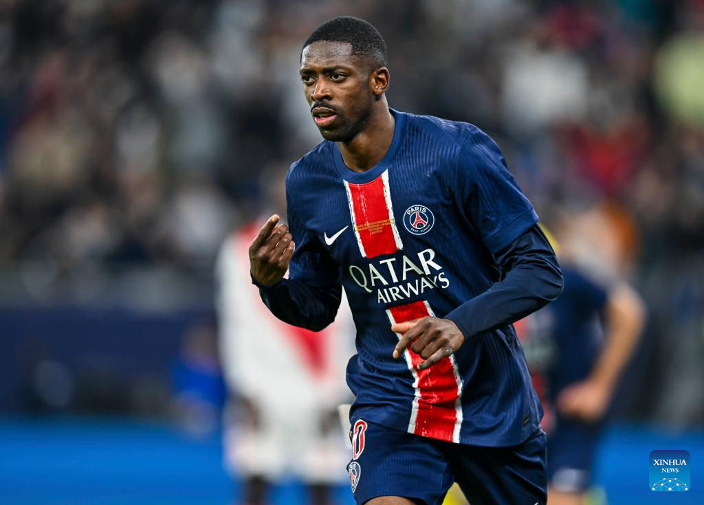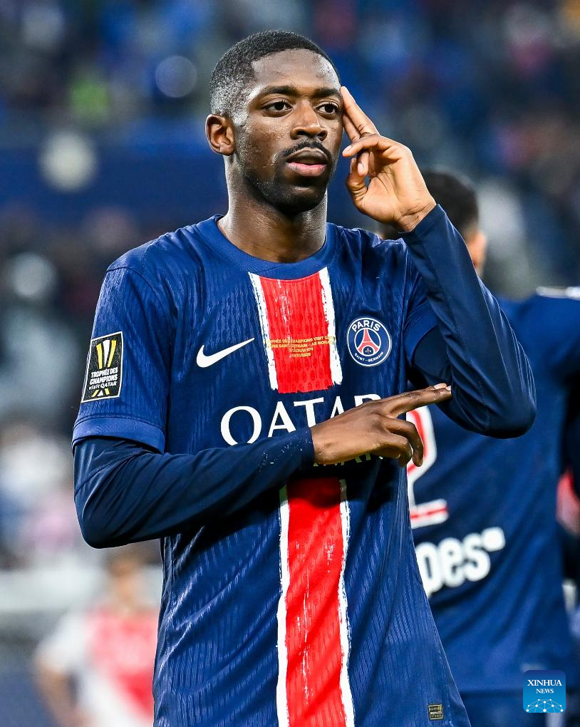 Ousmane Dembele of Paris Saint-Germain celebrates after scoring during the French Super Cup football final match between Paris Saint-Germain (PSG) and AS Monaco at the 974 stadium in Doha, Qatar on Jan. 5, 2025. (Photo by Nikku/Xinhua)