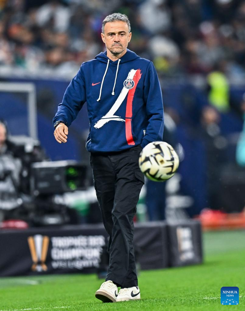 Luis Enrique, head coach of Paris Saint-Germain, reacts during the French Super Cup football final match between Paris Saint-Germain (PSG) and AS Monaco at the 974 stadium in Doha, Qatar on Jan. 5, 2025. (Photo by Nikku/Xinhua)