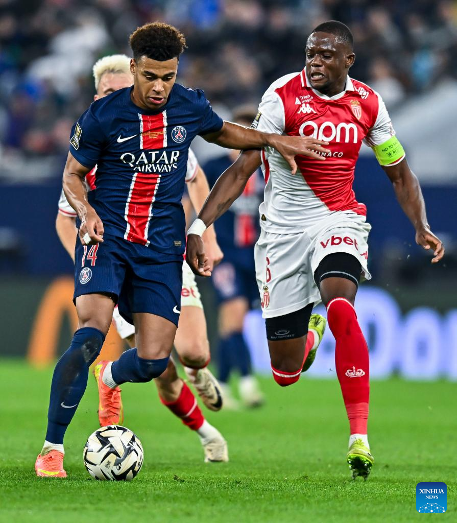 Desire Doue (L) of Paris Saint-Germain vies with Denis Zakaria of AS Monaco during the French Super Cup football final match between Paris Saint-Germain (PSG) and AS Monaco at the 974 stadium in Doha, Qatar on Jan. 5, 2025. (Photo by Nikku/Xinhua)