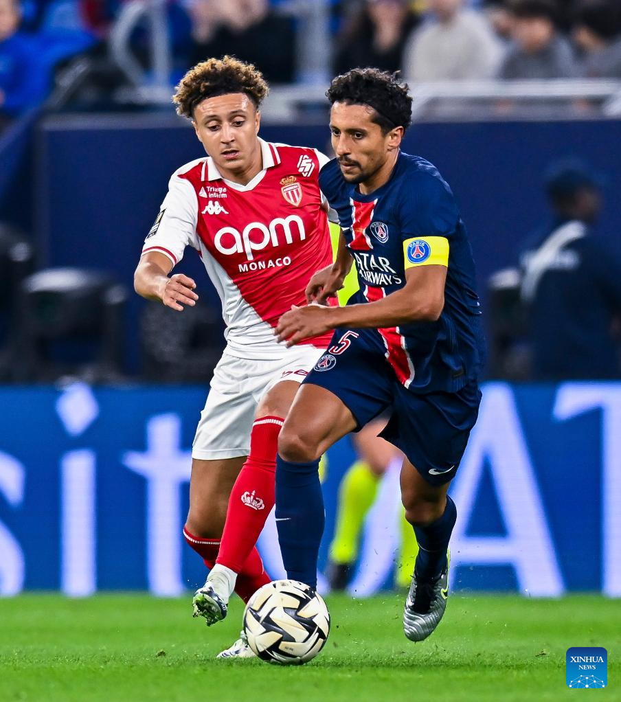 Marquinhos (R) of Paris Saint-Germain vies with Eliesse Ben Seghir of AS Monaco during the French Super Cup football final match between Paris Saint-Germain (PSG) and AS Monaco at the 974 stadium in Doha, Qatar on Jan. 5, 2025. (Photo by Nikku/Xinhua)