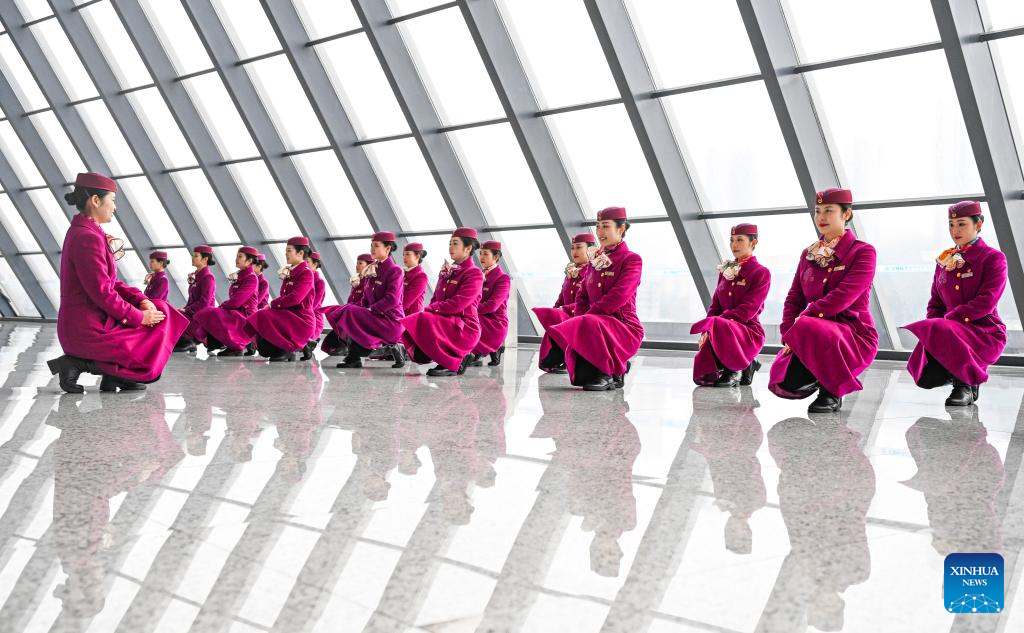 High-speed railway crew members take part in an etiquette training in Chongqing, southwest China, Jan. 8, 2025. The Chongqing branch of China Railway Chengdu Bureau Group Co., Ltd. organized training programs for high-speed railway crew members to improve service quality and prepare for the upcoming Spring Festival travel rush. (Xinhua/Wang Quanchao)