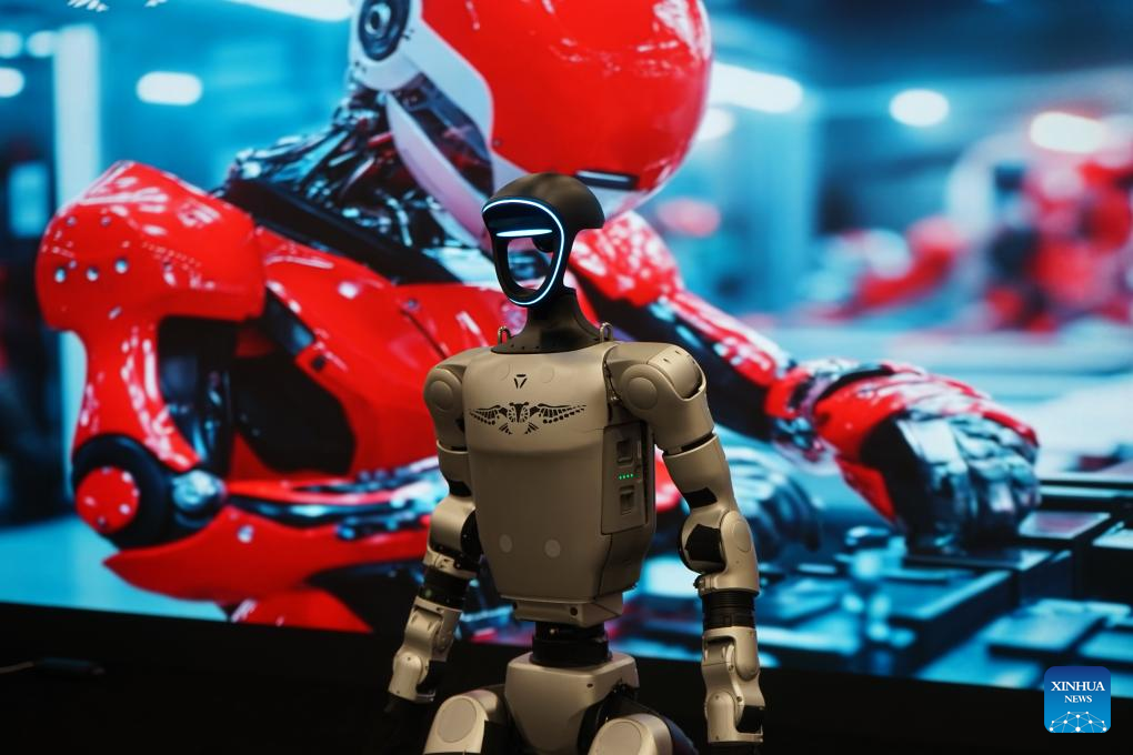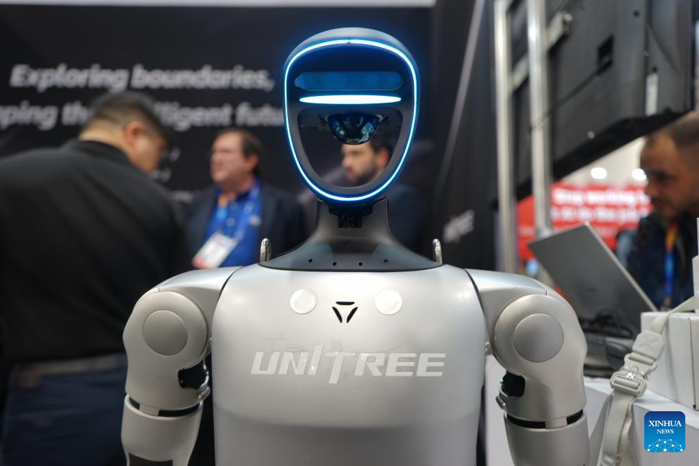 A robot is displayed at the exhibition area of Chinese company Unitree Robotics during the 2025 Consumer Electronics Show (CES) in Las Vegas, the United States, on Jan. 8, 2025. The 2025 Consumer Electronics Show (CES), the world's premier tech show, concluded in Las Vegas on Friday, showcasing latest advancement, new products and solutions in consumer technology. AI continues to be top theme at CES 2025, with new applications of AI across the show floor, driving everything from AI-powered chips to AI-enabled drug discovery to smart factory solutions. (Photo by Zeng Hui/Xinhua)