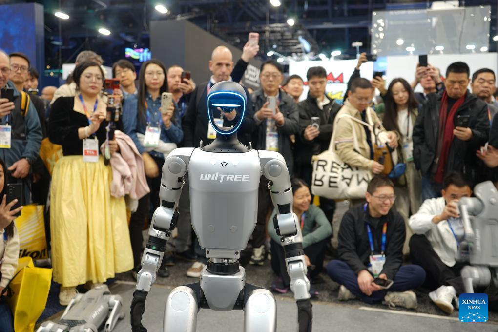 Visitors view a robot at the exhibition area of Chinese company Unitree Robotics during the 2025 Consumer Electronics Show (CES) in Las Vegas, the United States, on Jan. 8, 2025. The 2025 Consumer Electronics Show (CES), the world's premier tech show, concluded in Las Vegas on Friday, showcasing latest advancement, new products and solutions in consumer technology. AI continues to be top theme at CES 2025, with new applications of AI across the show floor, driving everything from AI-powered chips to AI-enabled drug discovery to smart factory solutions. (Photo by Zeng Hui/Xinhua)