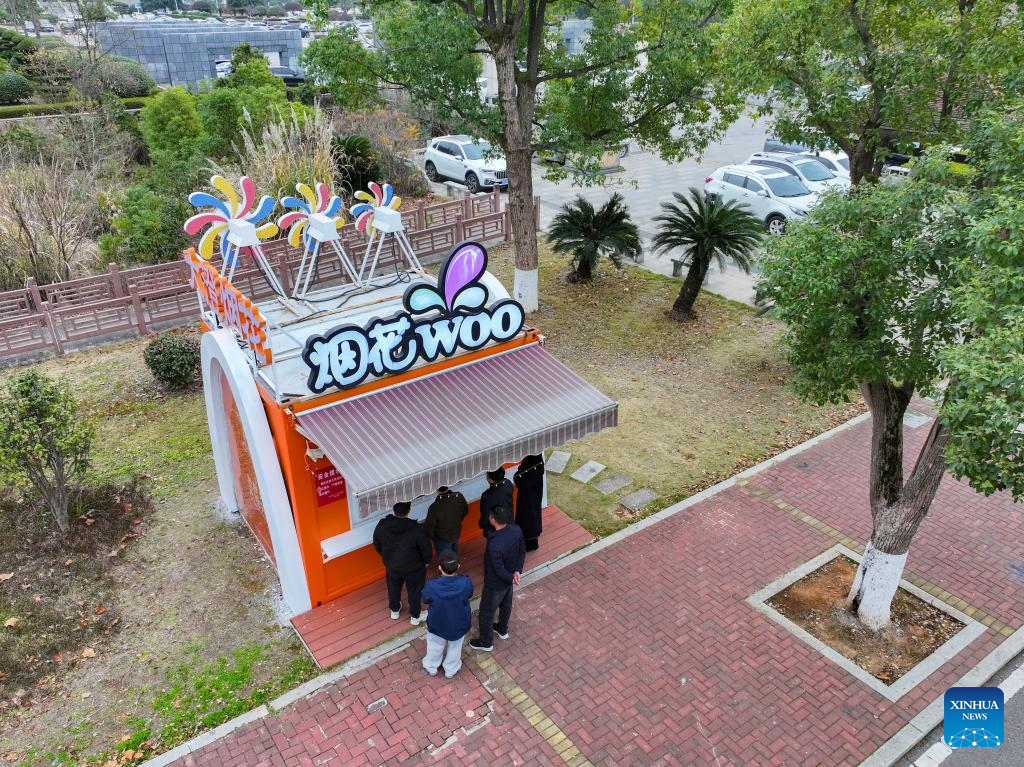 This drone photo taken on Jan. 7, 2025 shows citizens buying fireworks at a firework store near a square in Liuyang City, central China's Hunan Province. Liuyang, a county-level city in Changsha, capital of central China's Hunan Province, is deemed the world's fireworks hub. (Xinhua/Chen Zeguo)