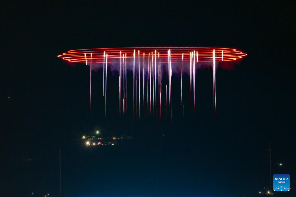 This photo taken on Dec. 7, 2024 shows a show combined fireworks and drone performance in Liuyang City, central China's Hunan Province. Liuyang, a county-level city in Changsha, capital of central China's Hunan Province, is deemed the world's fireworks hub. (Xinhua)