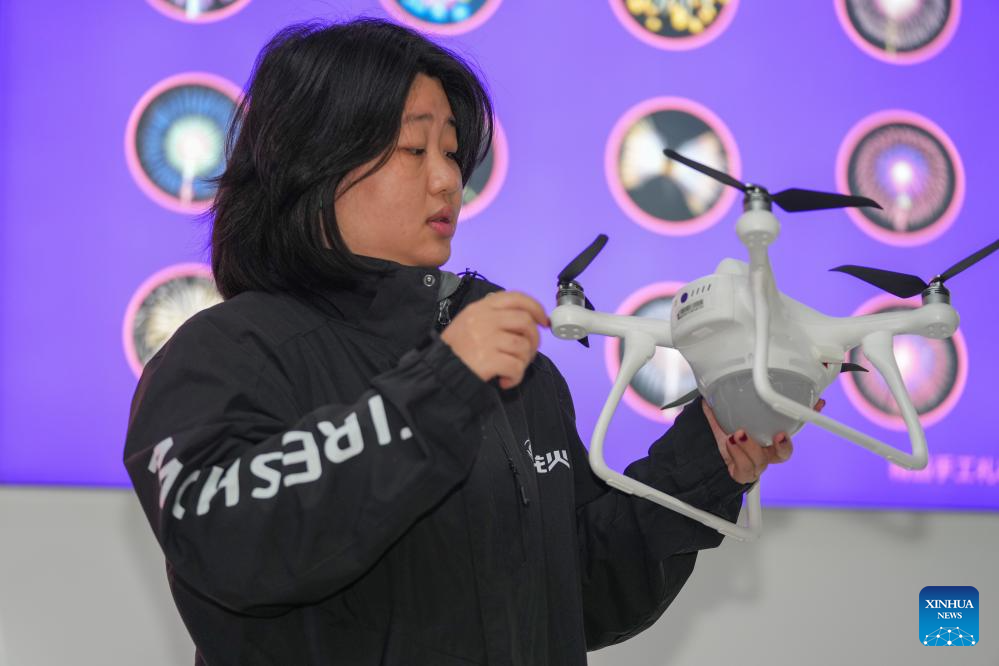 A staff member of a local firework company introduces a drone which has the ability to carry fireworks in Liuyang City, central China's Hunan Province, Jan. 7, 2025. Liuyang, a county-level city in Changsha, capital of central China's Hunan Province, is deemed the world's fireworks hub. (Xinhua/Chen Zeguo)