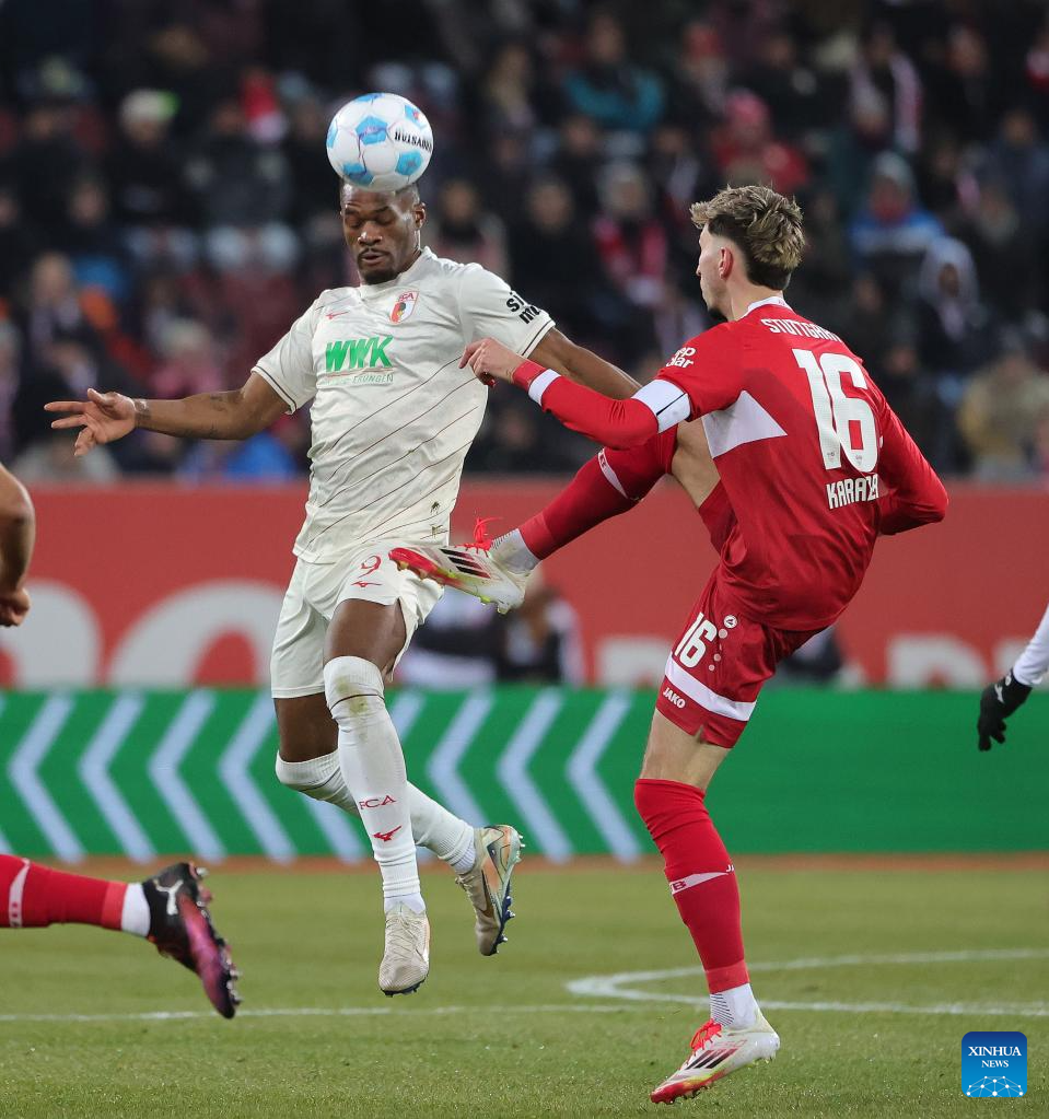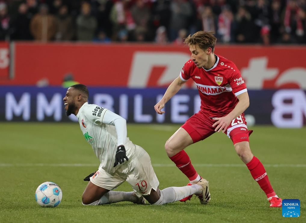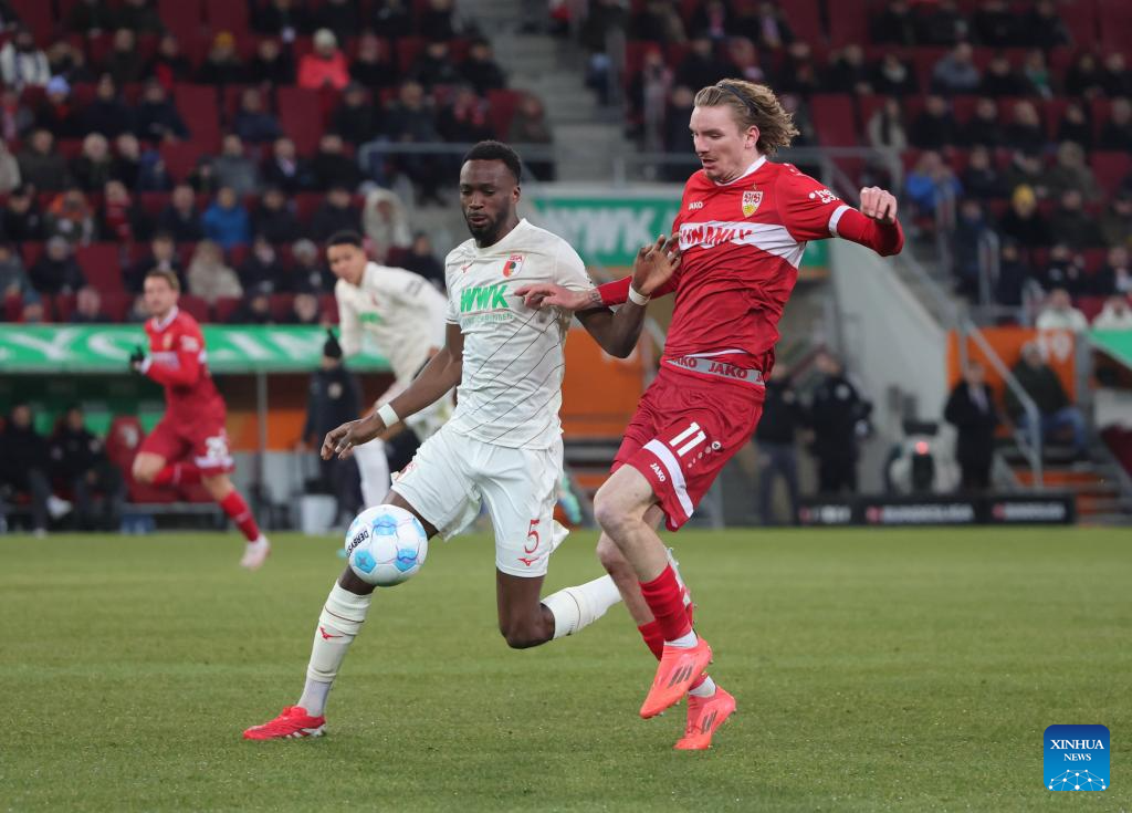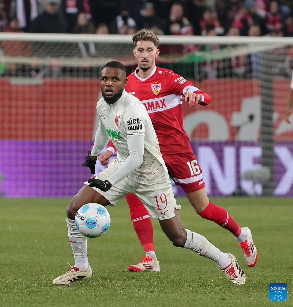Samuel Essende (L) of FC Augsburg vies with Jeff Chabot (R) of VfB Stuttgart during the German first division Bundesliga football match between FC Augsburg and VfB Stuttgart in Augsburg, Germany, Jan. 12, 2025. (Photo by Philippe Ruiz/Xinhua)