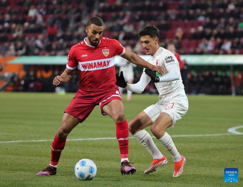 Samuel Essende (L) of FC Augsburg vies with Atakan Karazor of VfB Stuttgart during the German first division Bundesliga football match between FC Augsburg and VfB Stuttgart in Augsburg, Germany, Jan. 12, 2025. (Photo by Philippe Ruiz/Xinhua)