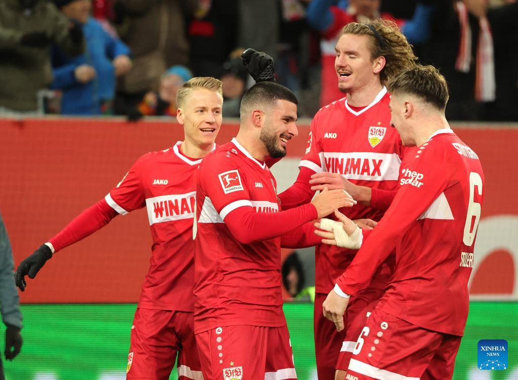 Deniz Undav (2nd L) of VfB Stuttgart celebrates his goal with teammates during the German first division Bundesliga football match between FC Augsburg and VfB Stuttgart in Augsburg, Germany, Jan. 12, 2025. (Photo by Philippe Ruiz/Xinhua)