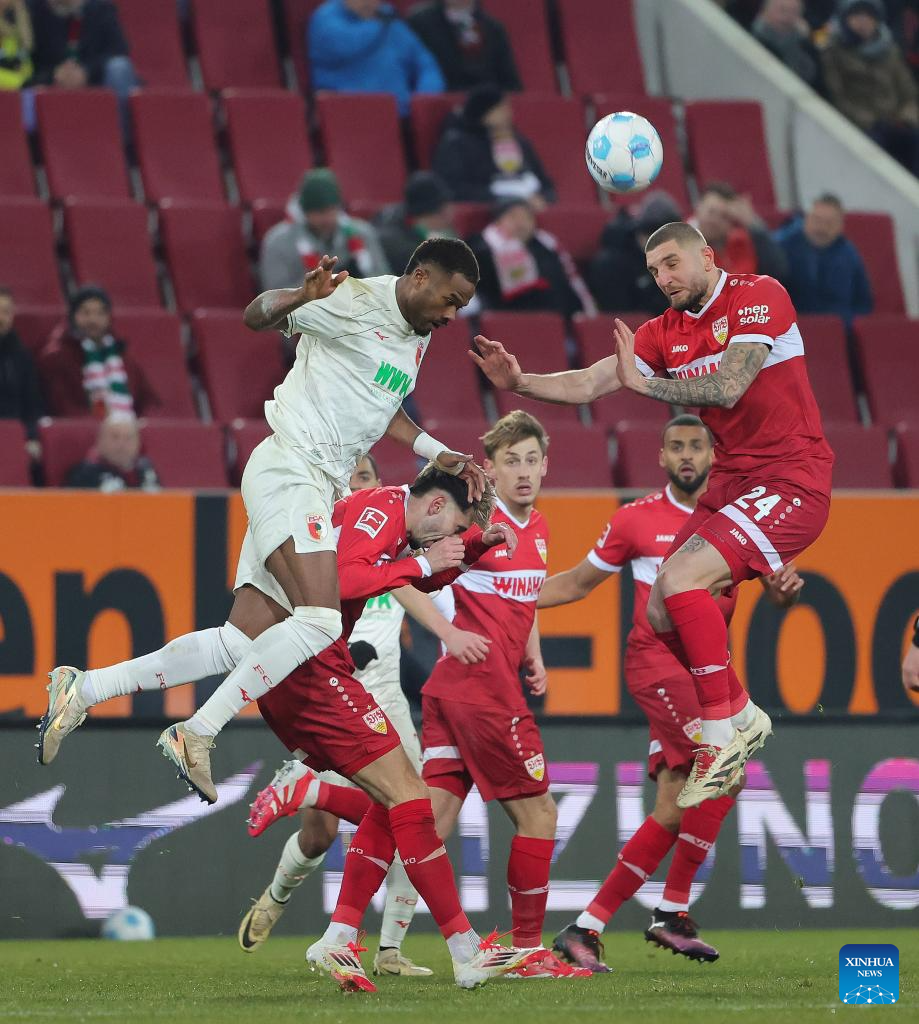 Chrislain Matsima (L) of FC Augsburg vies with Nick Woltemade of VfB Stuttgart during the German first division Bundesliga football match between FC Augsburg and VfB Stuttgart in Augsburg, Germany, Jan. 12, 2025. (Photo by Philippe Ruiz/Xinhua)