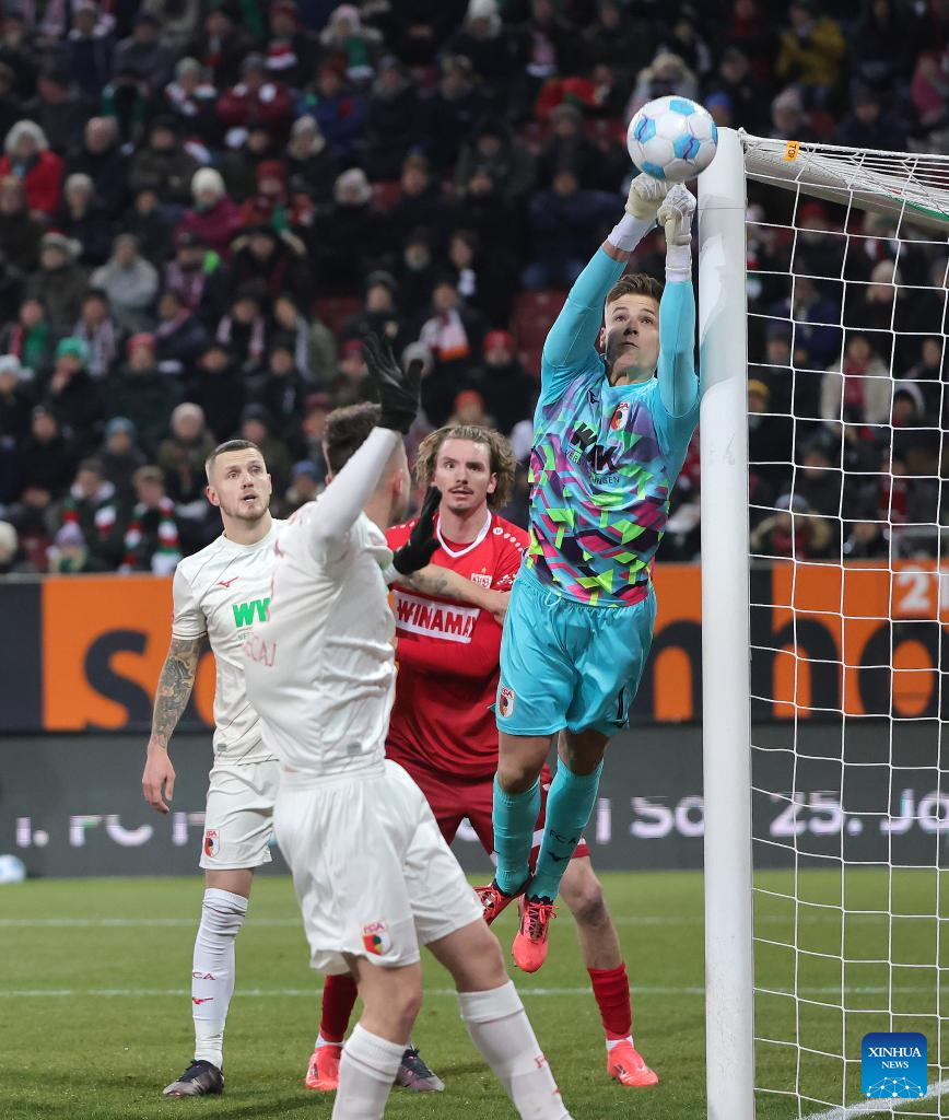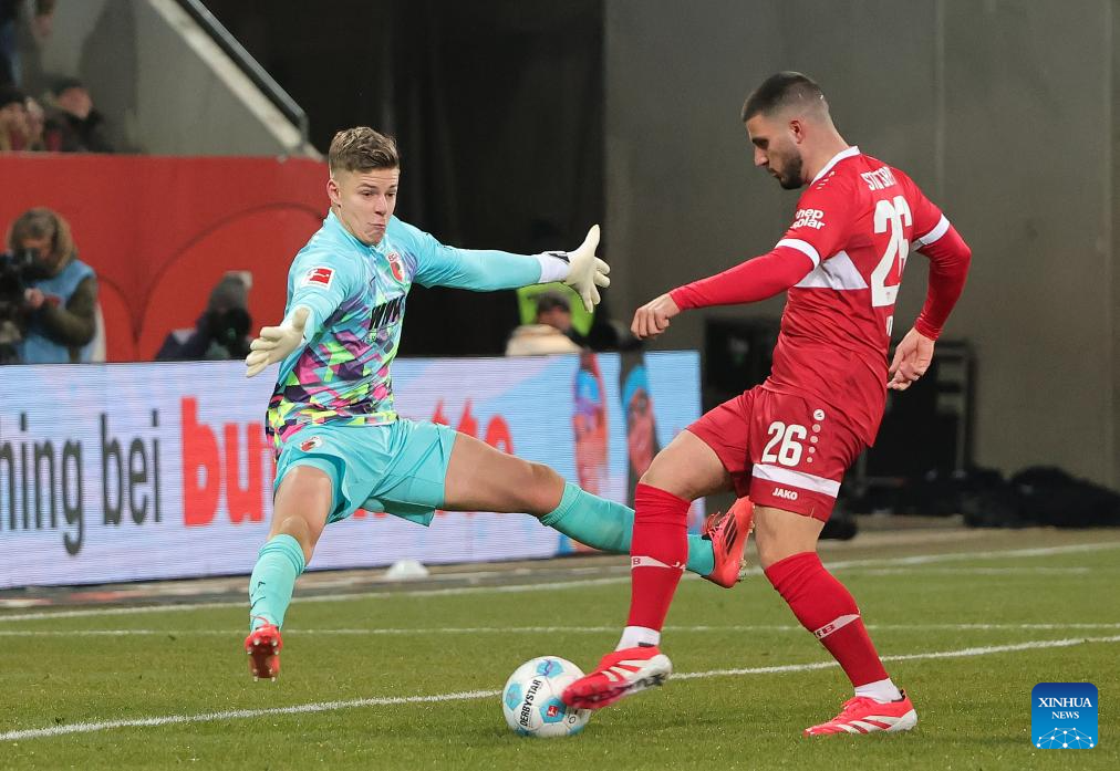 Goalkeeper Finn Dahmen (R) of FC Augsburg makes a save during the German first division Bundesliga football match between FC Augsburg and VfB Stuttgart in Augsburg, Germany, Jan. 12, 2025. (Photo by Philippe Ruiz/Xinhua)