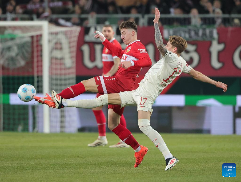 Josha Vagnoman (L) of VfB Stuttgart vies with Dimitrios Giannoulis of FC Augsburg during the German first division Bundesliga football match between FC Augsburg and VfB Stuttgart in Augsburg, Germany, Jan. 12, 2025. (Photo by Philippe Ruiz/Xinhua)