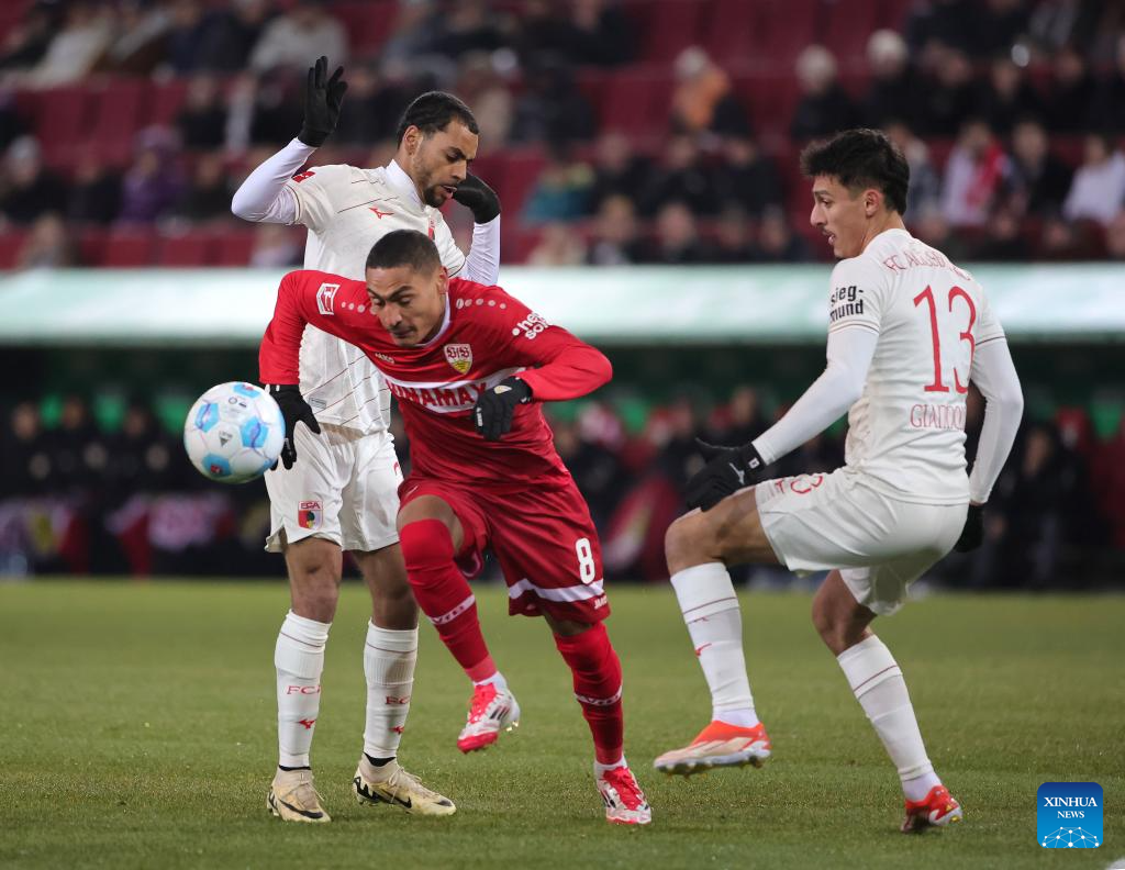 Enzo Millot (C) of VfB Stuttgart vies with Alexis Claude-Maurice (L) and Dimitrios Giannoulis of FC Augsburg during the German first division Bundesliga football match between FC Augsburg and VfB Stuttgart in Augsburg, Germany, Jan. 12, 2025. (Photo by Philippe Ruiz/Xinhua)