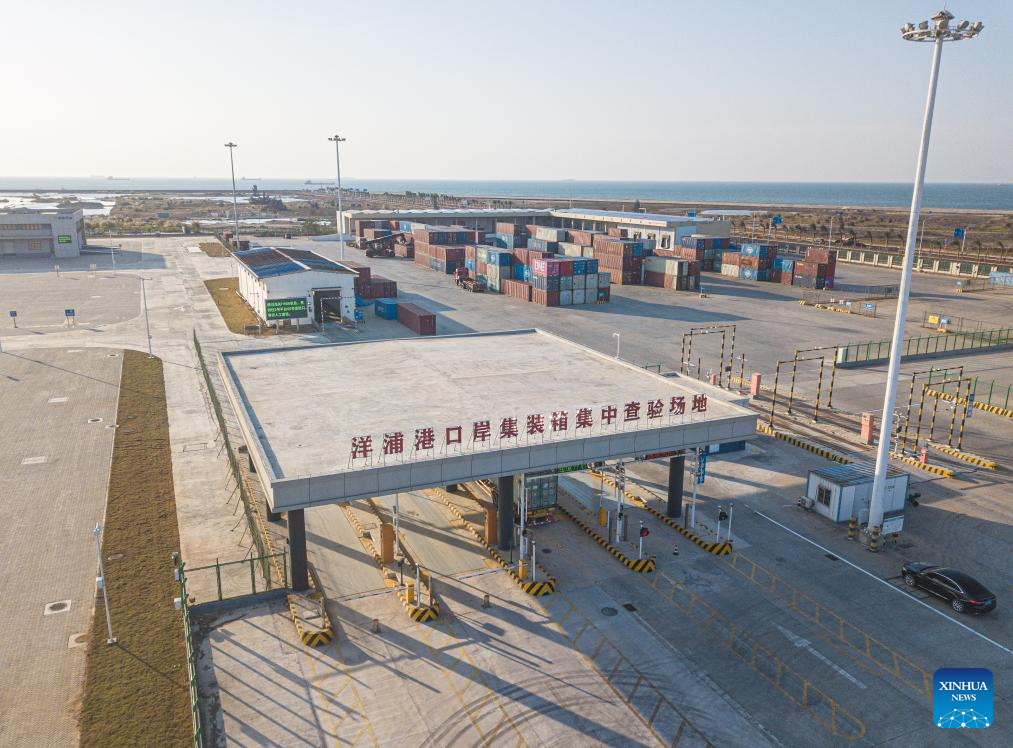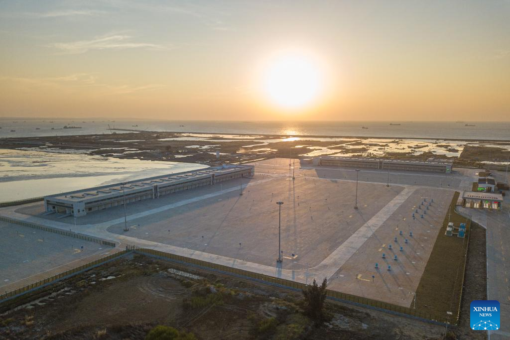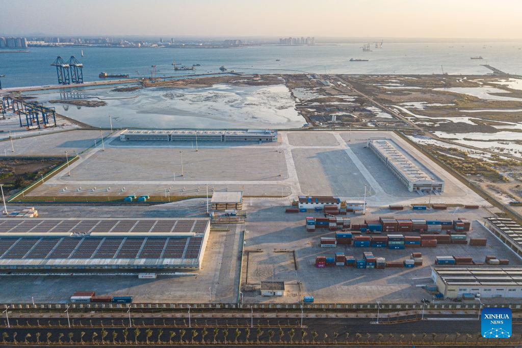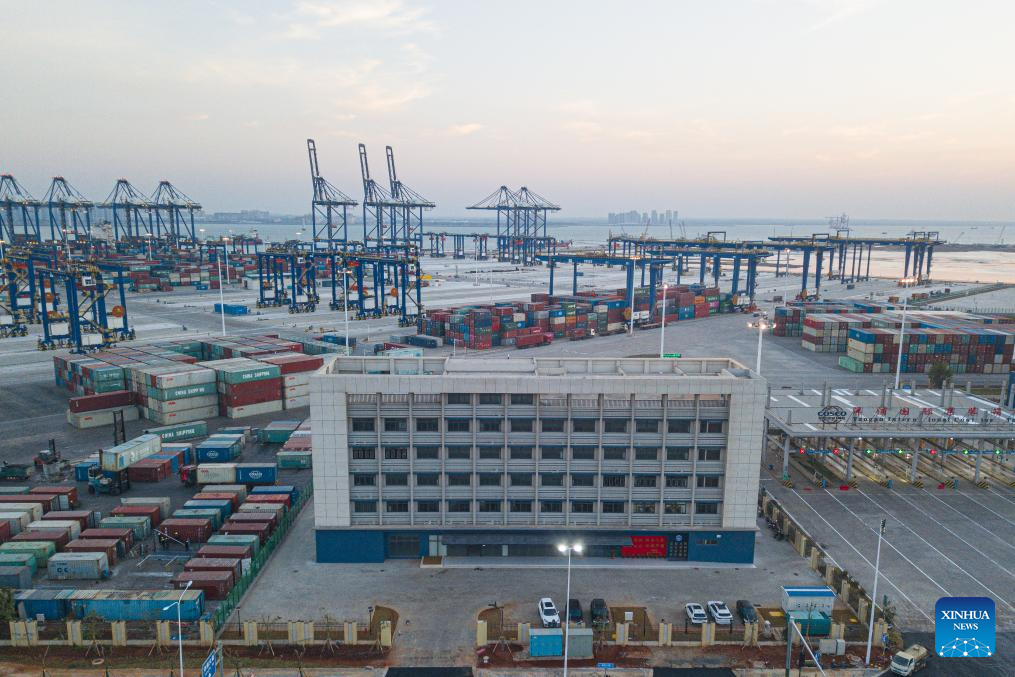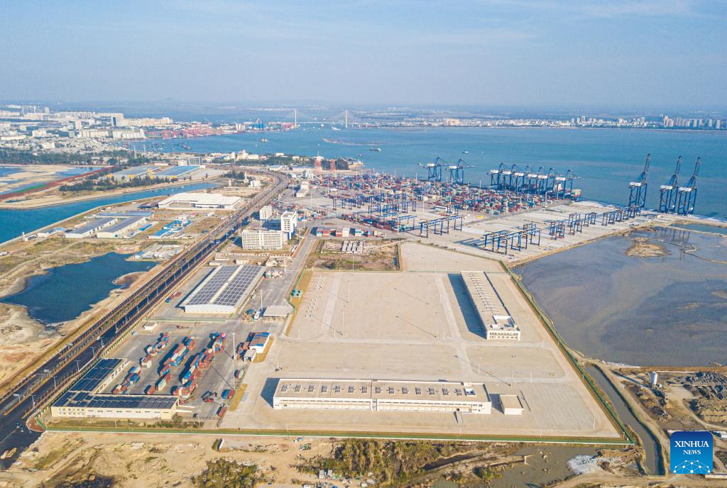 An aerial drone photo shows a construction site of a customs project of the Yangpu Port in the Yangpu Economic Development Zone in Danzhou, south China's Hainan Province, Jan. 12, 2025. (Xinhua/Pu Xiaoxu)
