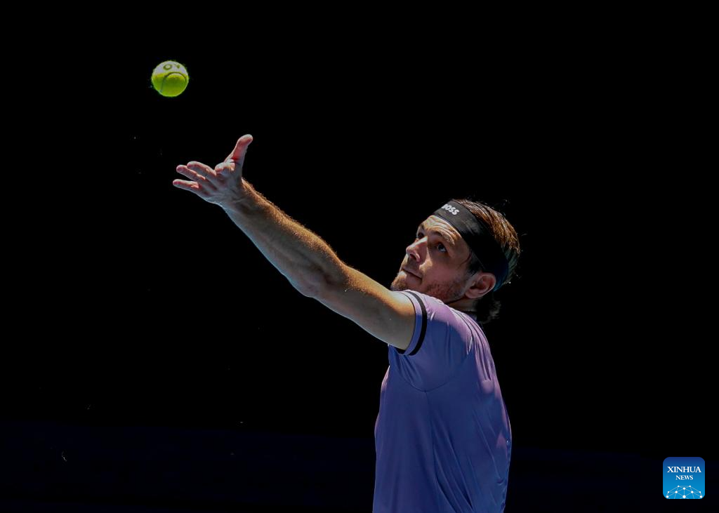 Taylor Fritz serves during the men's singles first round match between Taylor Fritz and Jenson Brooksby of the United States at Australian Open tennis tournament in Melbourne, Australia, Jan. 14, 2025. (Photo by Chu Chen/Xinhua)