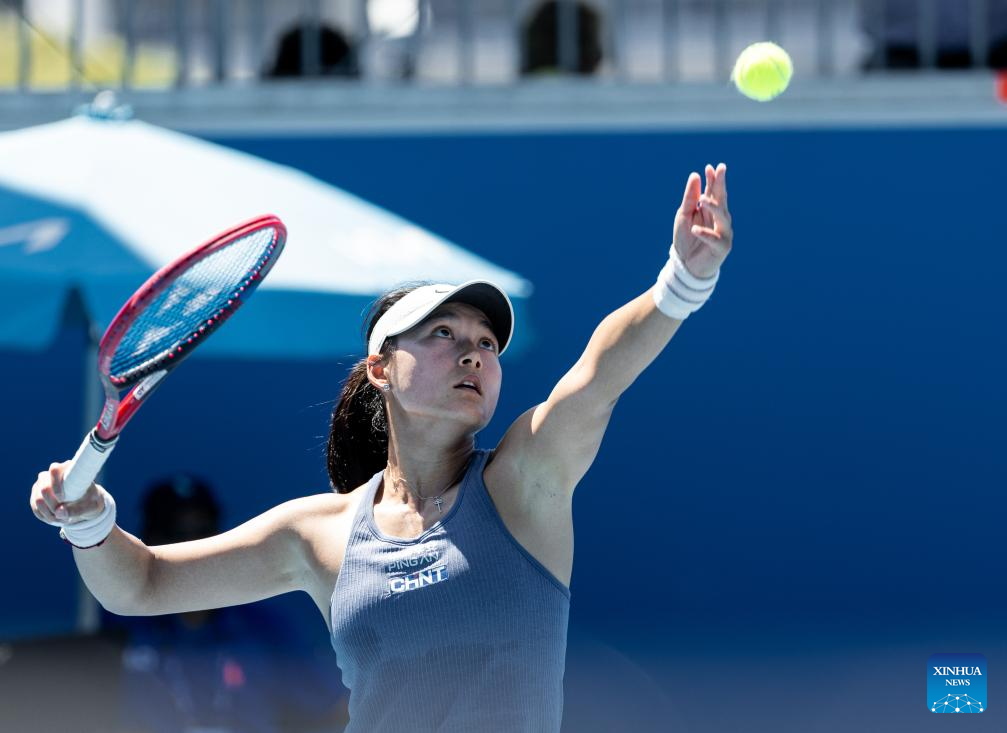Zheng Saisai serves during the women's singles first round match between Zheng Saisai of China and Erika Andreeva of Russia at Australian Open tennis tournament in Melbourne, Australia, Jan. 14, 2025. (Photo by Hu Jingchen/Xinhua)