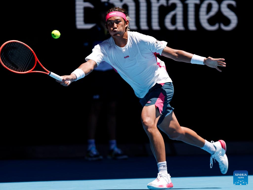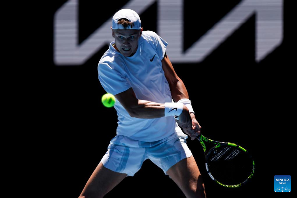 Zhang Zhizhen hits a return during the men's singles first round match between Zhang Zhizhen of China and Holger Rune of Denmark at Australian Open tennis tournament in Melbourne, Australia, Jan. 14, 2025. (Xinhua/Ma Ping)