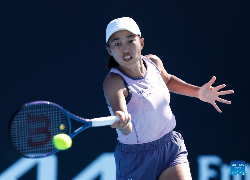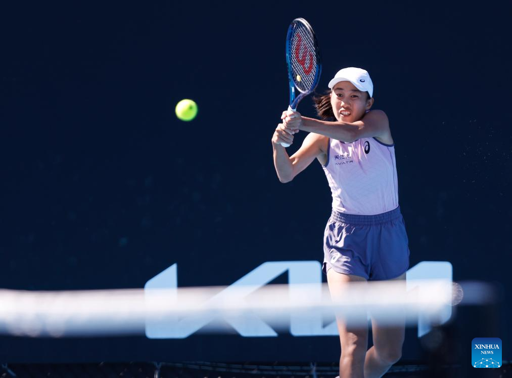 Zheng Saisai hits a return during the women's singles first round match between Zheng Saisai of China and Erika Andreeva of Russia at Australian Open tennis tournament in Melbourne, Australia, Jan. 14, 2025. (Photo by Hu Jingchen/Xinhua)