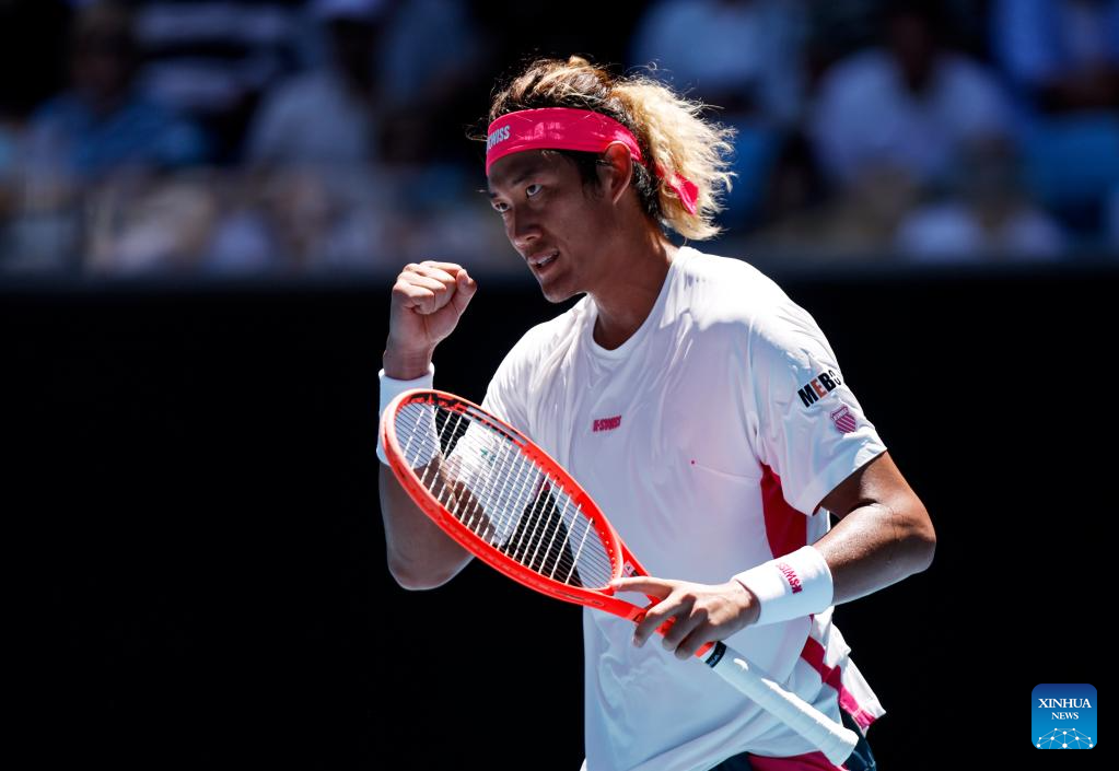 Zhang Zhizhen celebrates scoring during the men's singles first round match between Zhang Zhizhen of China and Holger Rune of Denmark at Australian Open tennis tournament in Melbourne, Australia, Jan. 14, 2025. (Xinhua/Ma Ping)