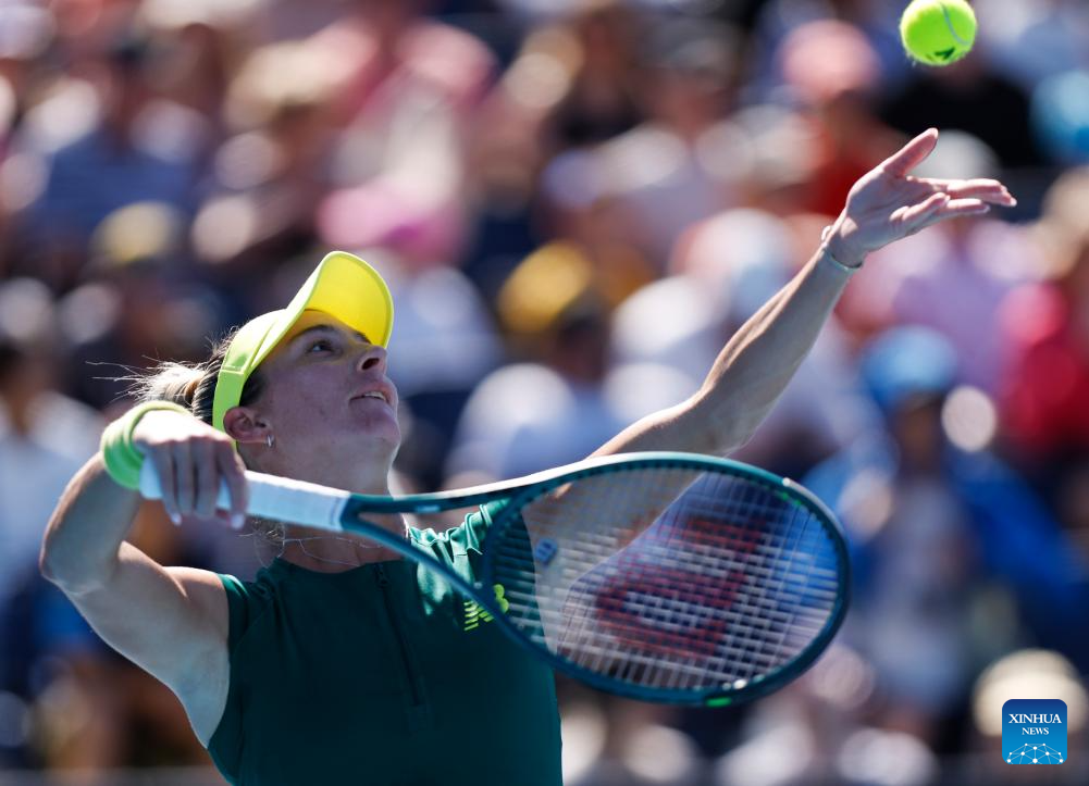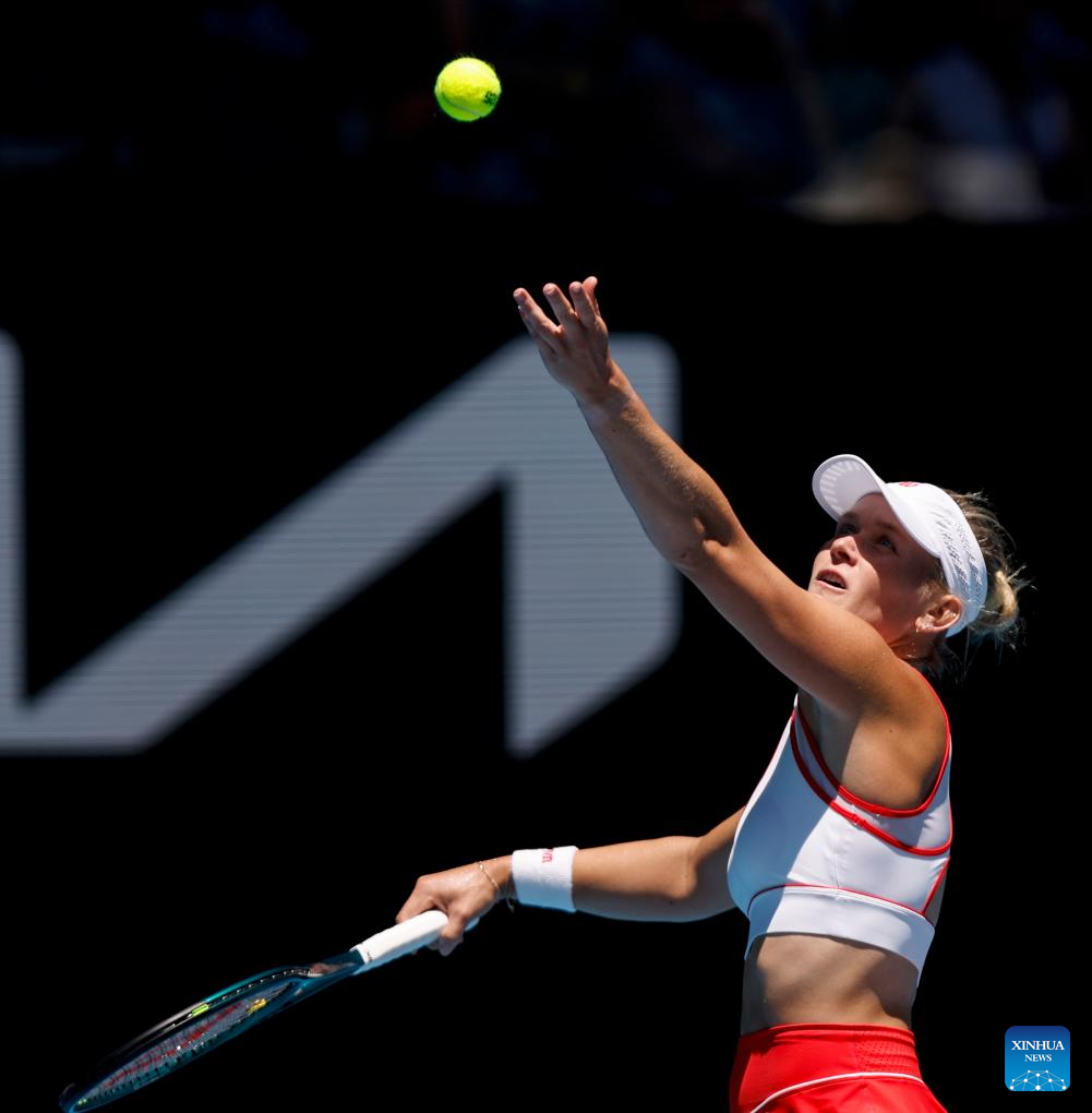 McCartney Kessler serves during the women's singles first round match between Zhang Shuai of China and McCartney Kessler of the United States at Australian Open tennis tournament in Melbourne, Australia, Jan. 14, 2025. (Xinhua/Ma Ping)