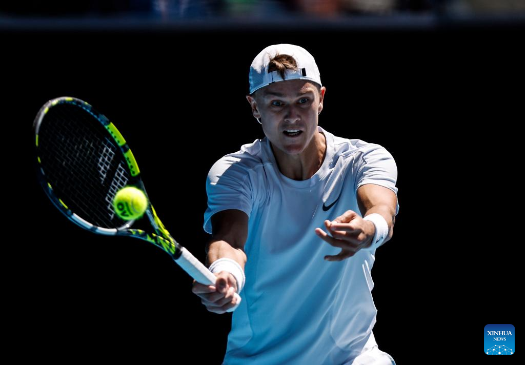 Holger Rune hits a return during the men's singles first round match between Zhang Zhizhen of China and Holger Rune of Denmark at Australian Open tennis tournament in Melbourne, Australia, Jan. 14, 2025. (Xinhua/Ma Ping)