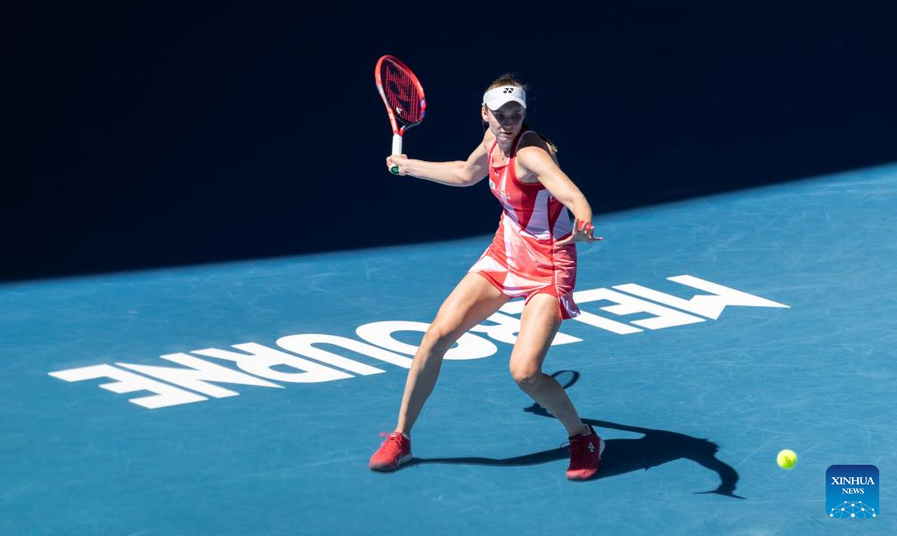 Elena Rybakina hits a return during the women's singles first round match between Elena Rybakina of Kazakhstan and Emerson Jones of Australia at Australian Open tennis tournament in Melbourne, Australia, Jan. 14, 2025. (Photo by Hu Jingchen/Xinhua)