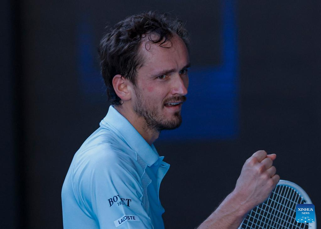 Daniil Medvedev celebrates scoring during the men's singles first round match between Daniil Medvedev of Russia and Kasidit Samrej of Thailand at Australian Open tennis tournament in Melbourne, Australia, Jan. 14, 2025. (Photo by Chu Chen/Xinhua)