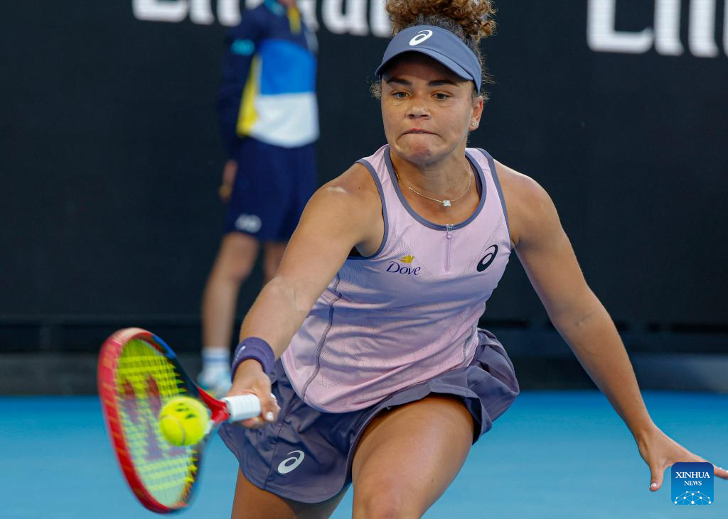 Peyton Stearns hits a return during the women's singles first round match between Emma Navarro and Peyton Stearns of the United States at Australian Open tennis tournament in Melbourne, Australia, Jan. 14, 2025. (Xinhua/Ma Ping)