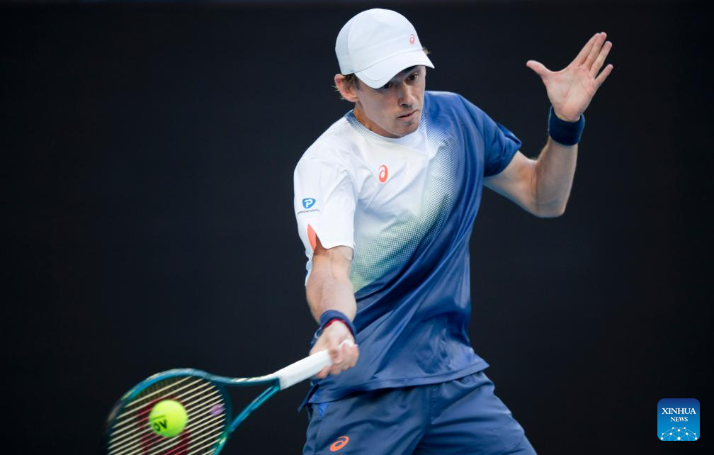 Alex de Minaur hits a return during the men's singles first round match between Alex de Minaur of Australia and Botic van de Zandschulp of the Netherlands at Australian Open tennis tournament in Melbourne, Australia, Jan. 14, 2025. (Xinhua/Lui Siu Wai)