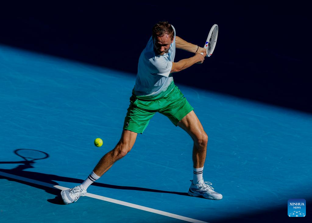 Daniil Medvedev hits a return during the men's singles first round match between Daniil Medvedev of Russia and Kasidit Samrej of Thailand at Australian Open tennis tournament in Melbourne, Australia, Jan. 14, 2025. (Photo by Chu Chen/Xinhua)