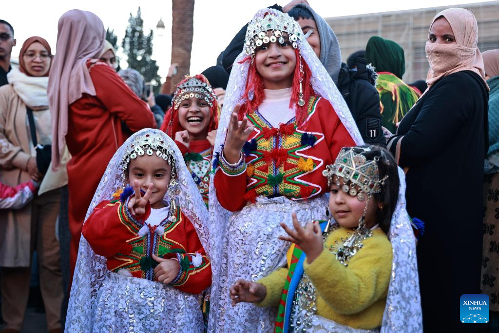 Girls in national costumes attend the celebration of the Amazigh New Year in Rabat, Morocco, Jan. 14, 2025. (Xinhua/Huo Jing)