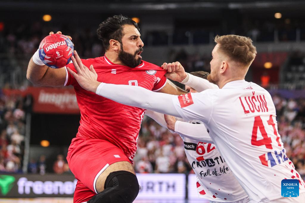 Ali Eid (L) of Bahrain vies with Tin Lucin of Croatia during the 2025 IHF Men's Handball World Championship Group H Round 1 match between Croatia and Bahrain at Zagreb Arena in Zagreb, Croatia, on Jan. 15, 2025. (Luka Stanzl/PIXSELL via Xinhua)