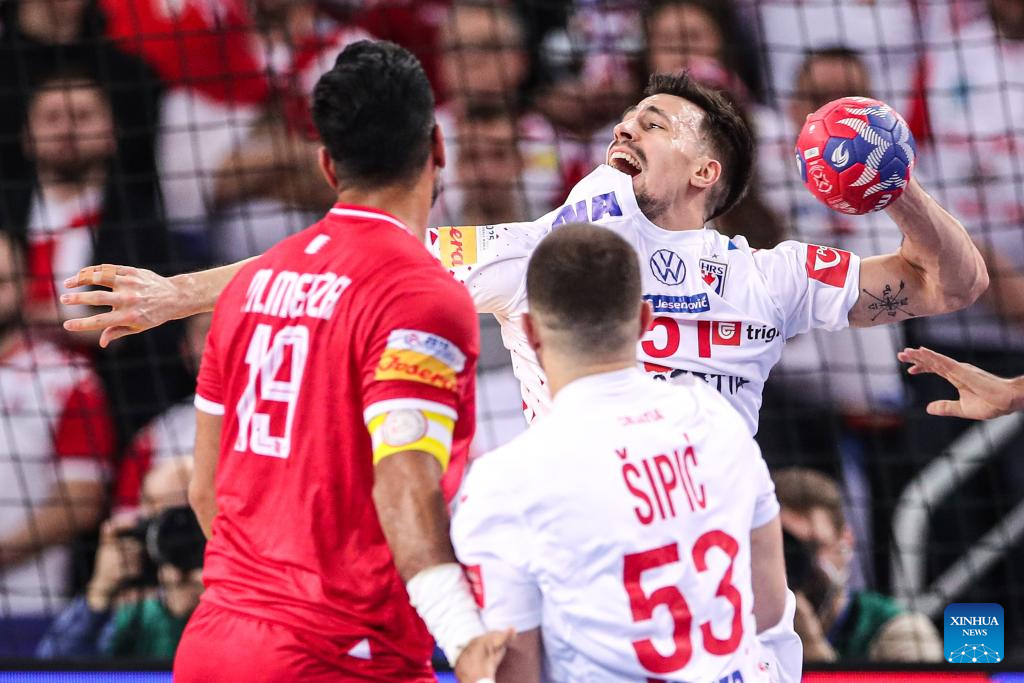 Luka Cindric (C) of Croatia shoots the ball during the 2025 IHF Men's Handball World Championship Group H Round 1 match between Croatia and Bahrain at Zagreb Arena in Zagreb, Croatia, on Jan. 15, 2025. (Luka Stanzl/PIXSELL via Xinhua)