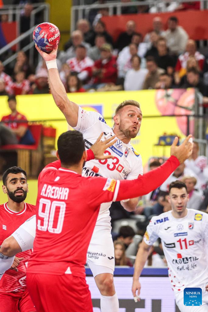 Ali Eid (C) of Bahrain shoots the ball during the 2025 IHF Men's Handball World Championship Group H Round 1 match between Croatia and Bahrain at Zagreb Arena in Zagreb, Croatia, on Jan. 15, 2025. (Luka Stanzl/PIXSELL via Xinhua)