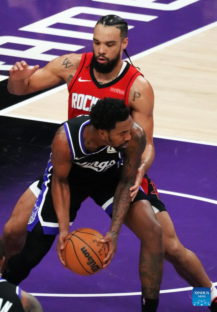 Malik Monk (bottom) of Sacramento Kings competes during the NBA regular season game between Sacramento Kings and Houston Rockets in Sacramento, the United States, Jan. 16, 2025. (Photo by Sun Yuxuan/Xinhua)