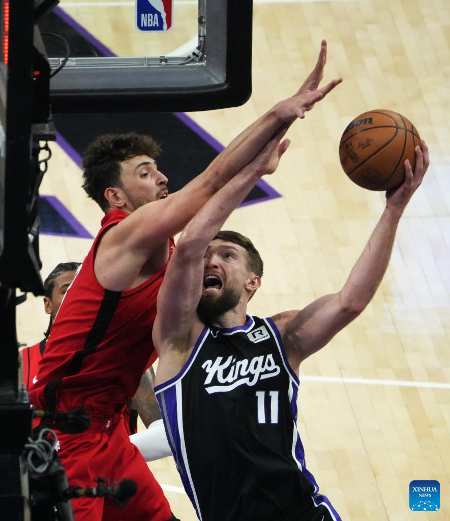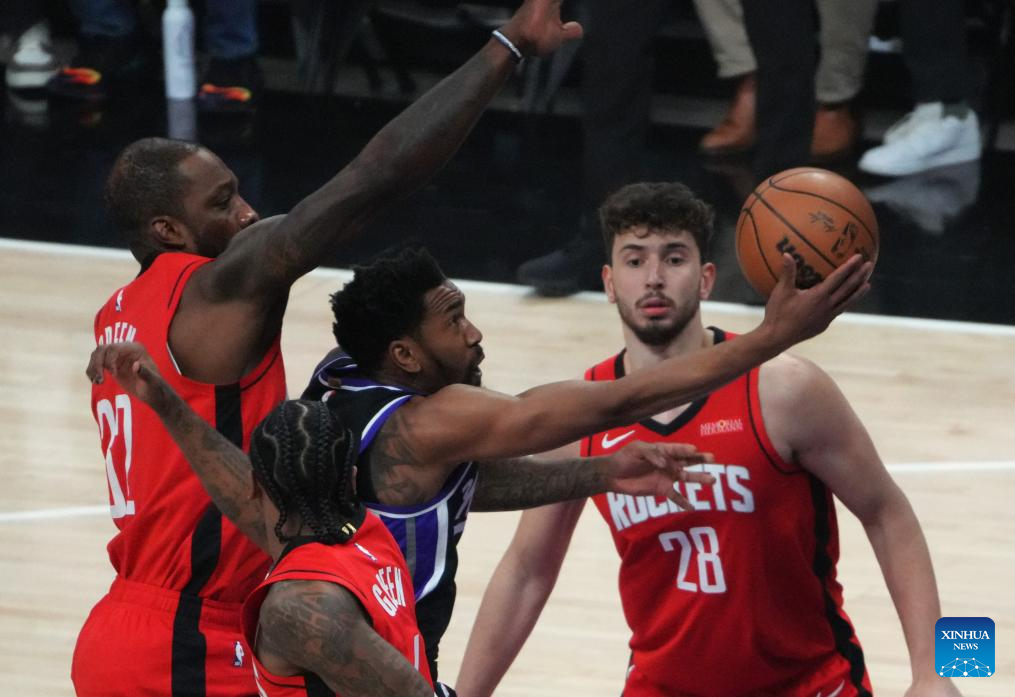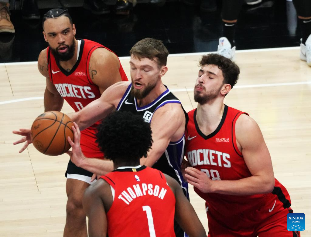 Domantas Sabonis (C) of Sacramento Kings competes during the NBA regular season game between Sacramento Kings and Houston Rockets in Sacramento, the United States, Jan. 16, 2025. (Photo by Sun Yuxuan/Xinhua)
