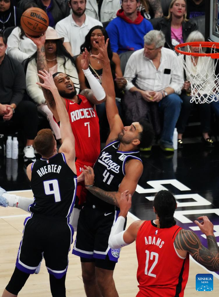 Malik Monk (C) of Sacramento Kings goes up for a layup during the NBA regular season game between Sacramento Kings and Houston Rockets in Sacramento, the United States, Jan. 16, 2025. (Photo by Sun Yuxuan/Xinhua)