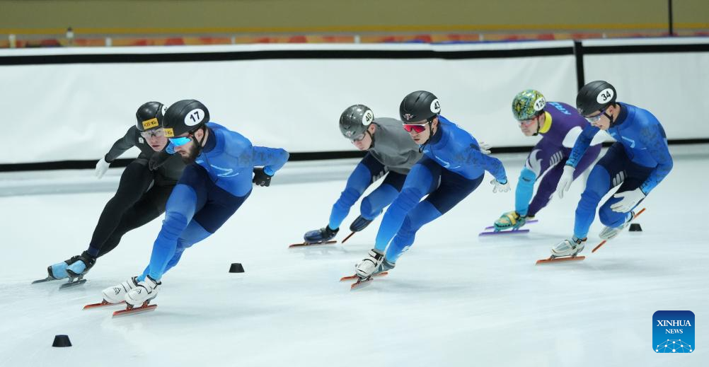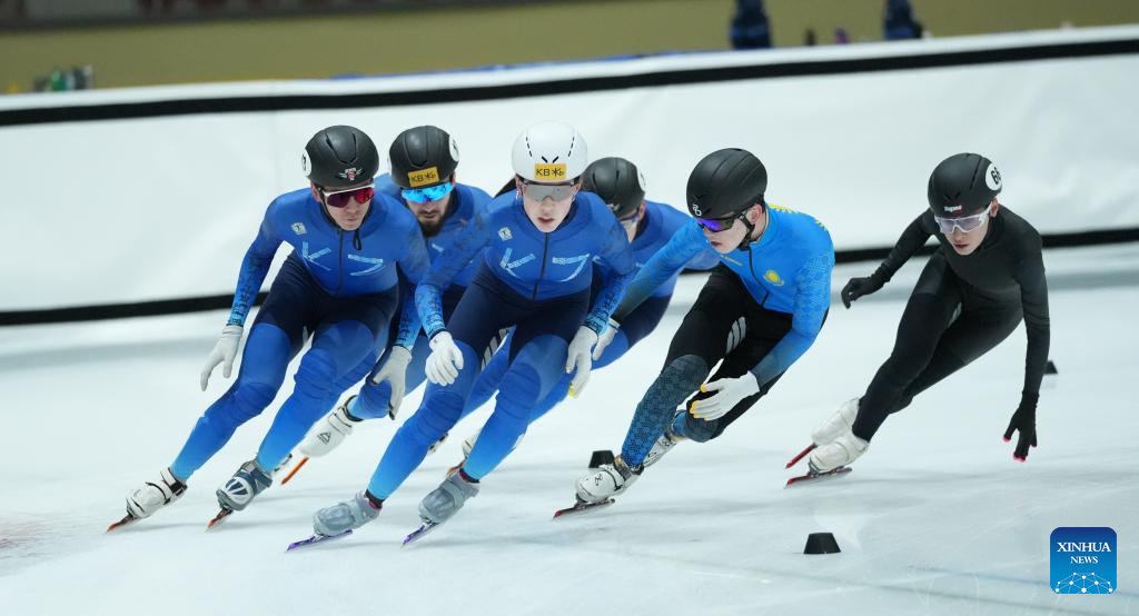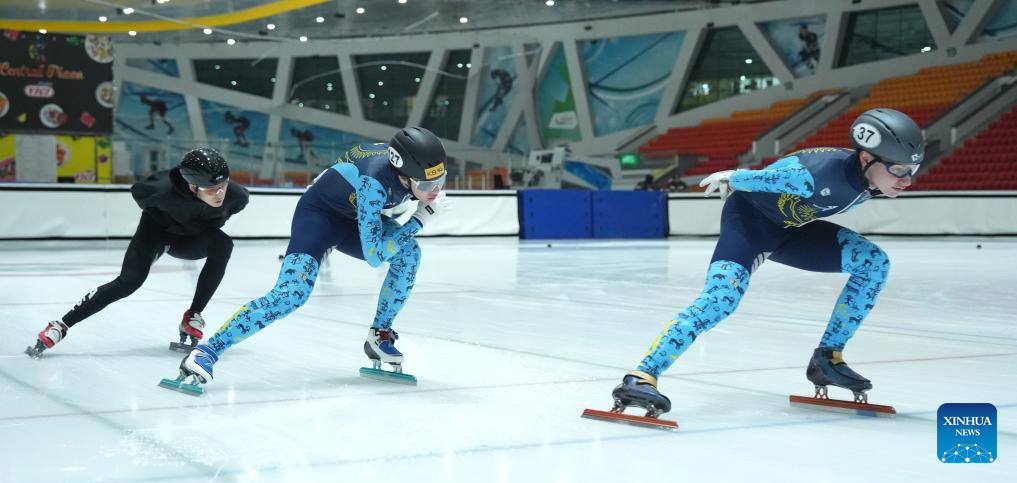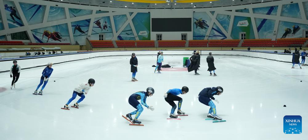 The Kazakhstan national short track speed skaters conduct pre-match training for the upcoming 2025 Harbin Asian Winter Games in Astana, Kazakhstan, Jan. 16, 2025. (Photo by Kalizhan Ospanov/Xinhua)