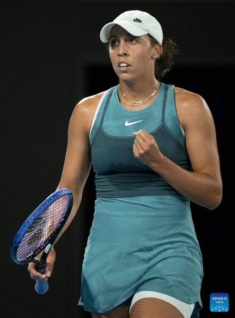 Madison Keys reacts during the women's singles 3rd round match between Madison Keys of the United States and Danielle Collins of the United States at Australian Open tennis tournament in Melbourne, Australia, Jan. 18, 2025. (Xinhua/Lui Siu Wai)