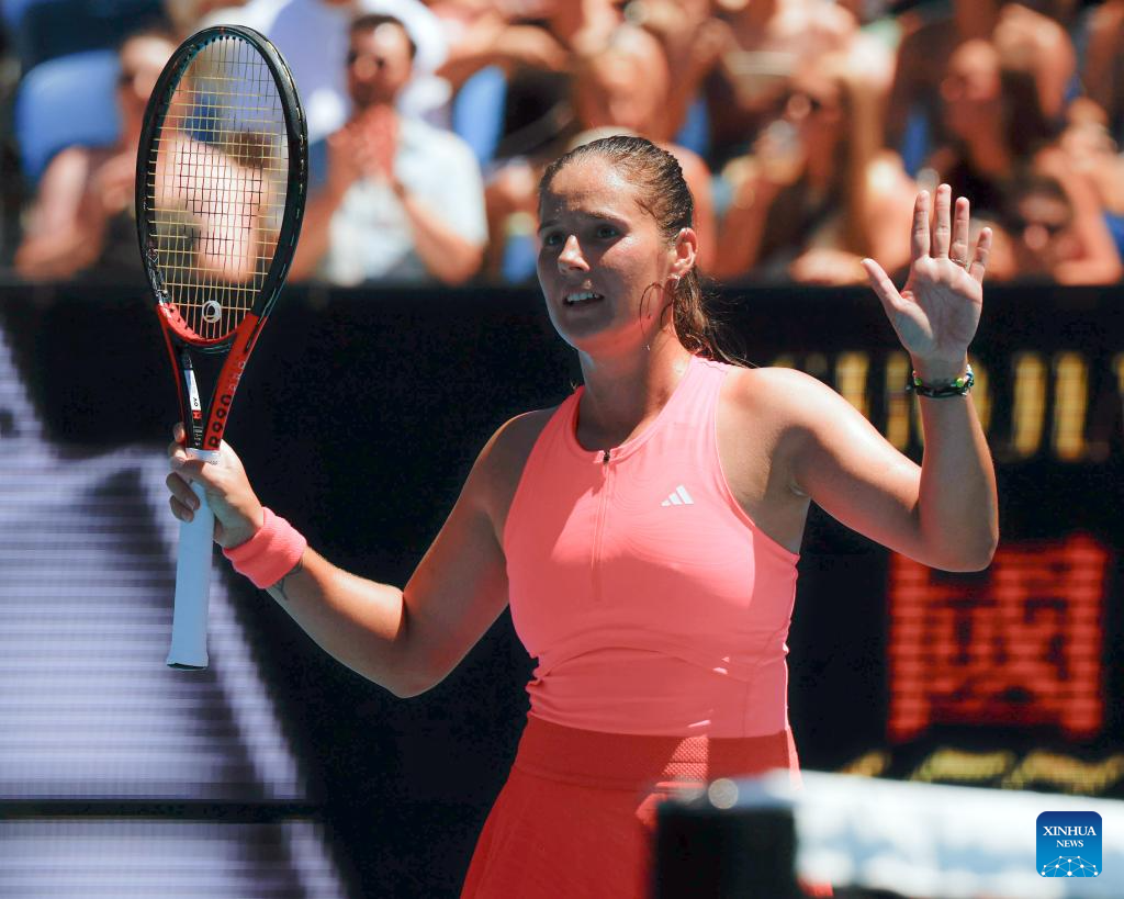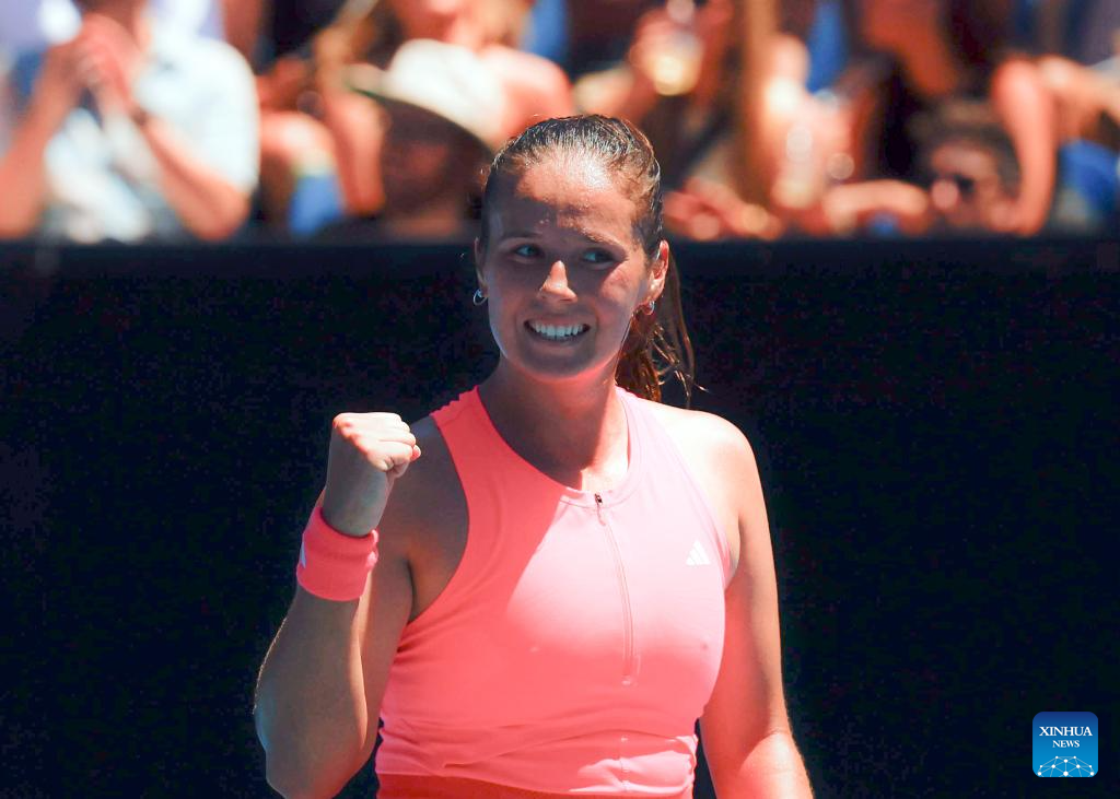 Daria Kasatkina celebrates after winning the women's singles third round match between Daria Kasatkina of Russia and Yulia Putintseva of Kazakhstan at Australian Open tennis tournament in Melbourne, Australia, Jan. 18, 2025. (Photo by Chu Chen/Xinhua)