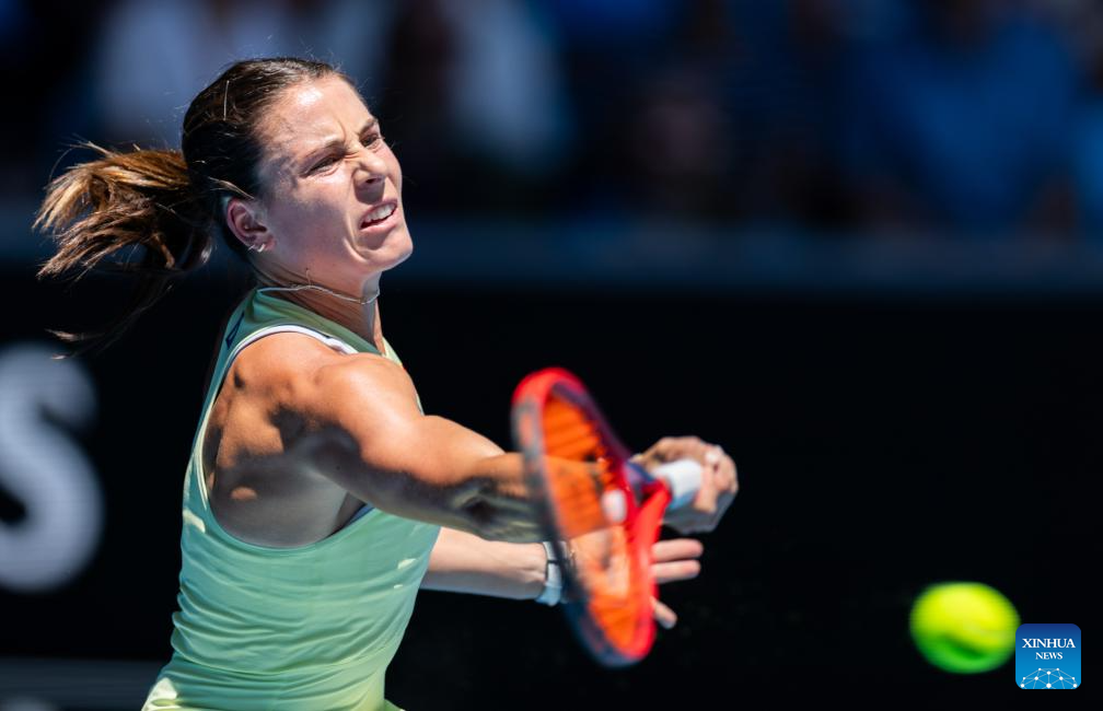 Danielle Collins hits a return during the women's singles 3rd round match between Madison Keys of the United States and Danielle Collins of the United States at Australian Open tennis tournament in Melbourne, Australia, Jan. 18, 2025. (Xinhua/Lui Siu Wai)