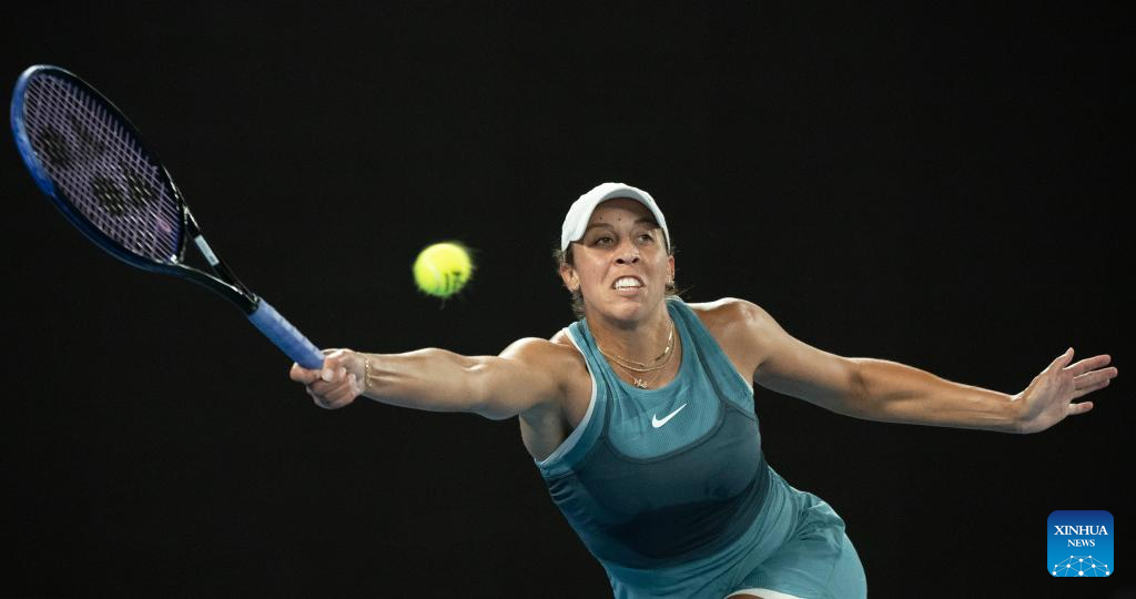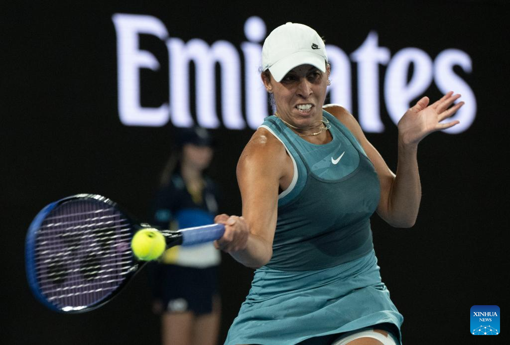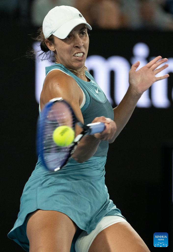 Madison Keys hits a return during the women's singles 3rd round match between Madison Keys of the United States and Danielle Collins of the United States at Australian Open tennis tournament in Melbourne, Australia, Jan. 18, 2025. (Xinhua/Lui Siu Wai)