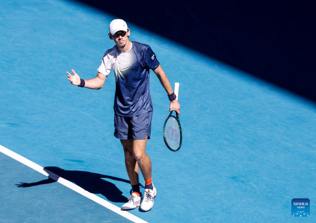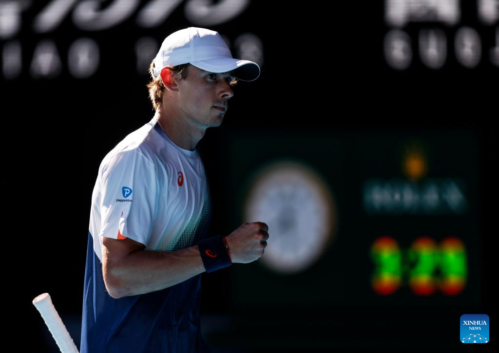 Alex de Minaur celebrates scoring during the men's singles 3rd round match between Alex de Minaur of Australia and Francisco Cerundolo of Argentina at Australian Open tennis tournament in Melbourne, Australia, Jan. 18, 2025. (Xinhua/Ma Ping)