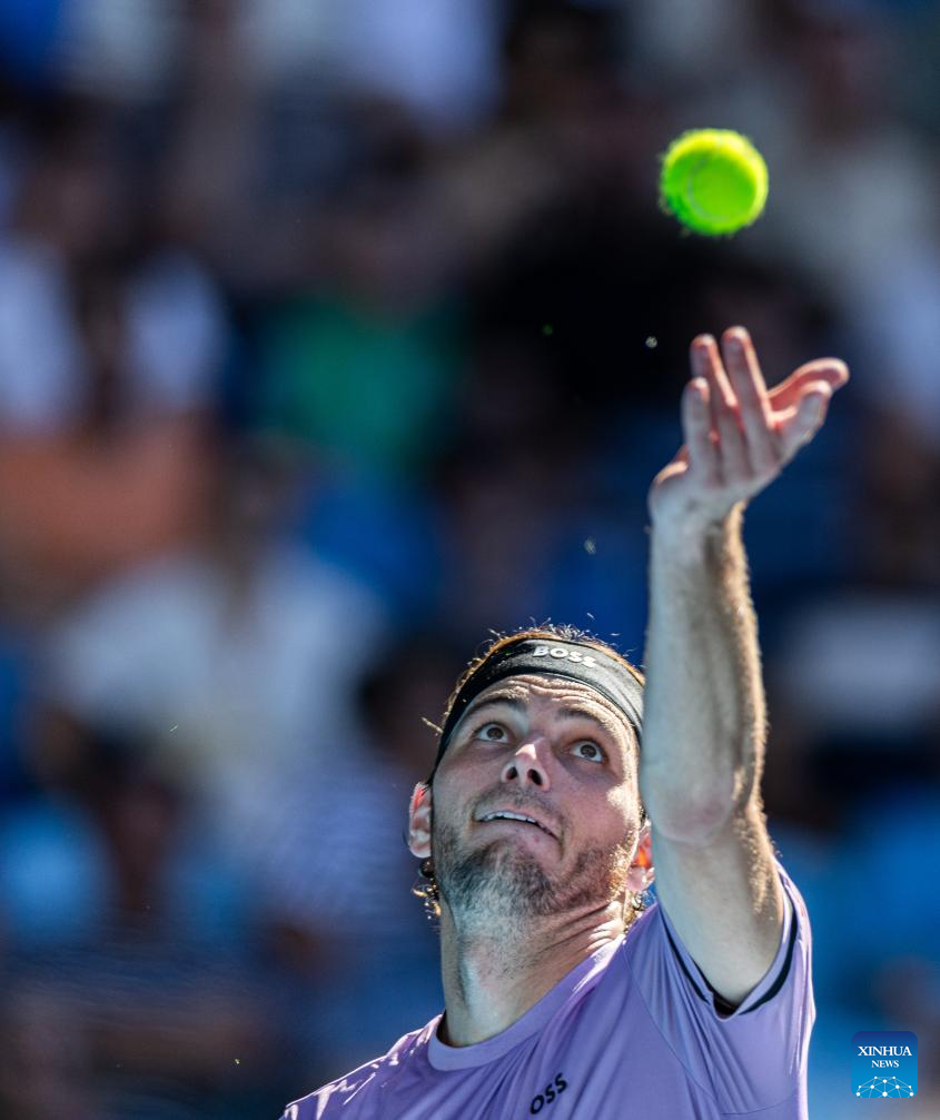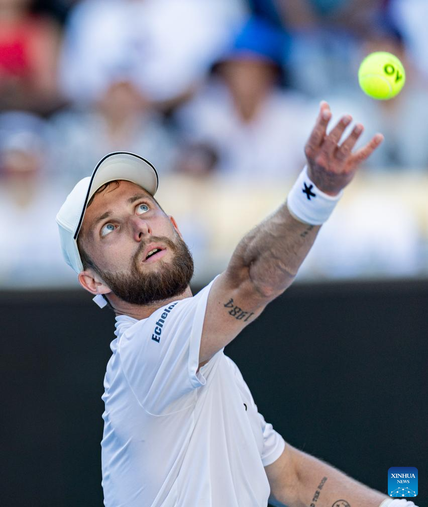 Francisco Cerundolo serves during the men's singles 3rd round match between Alex de Minaur of Australia and Francisco Cerundolo of Argentina at Australian Open tennis tournament in Melbourne, Australia, Jan. 18, 2025. (Xinhua/Ma Ping)